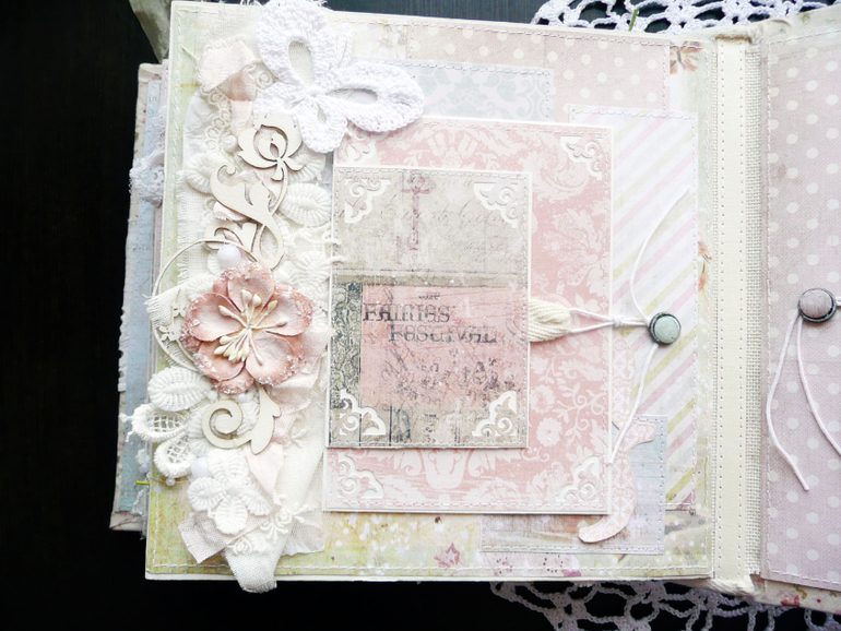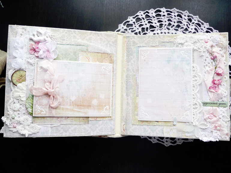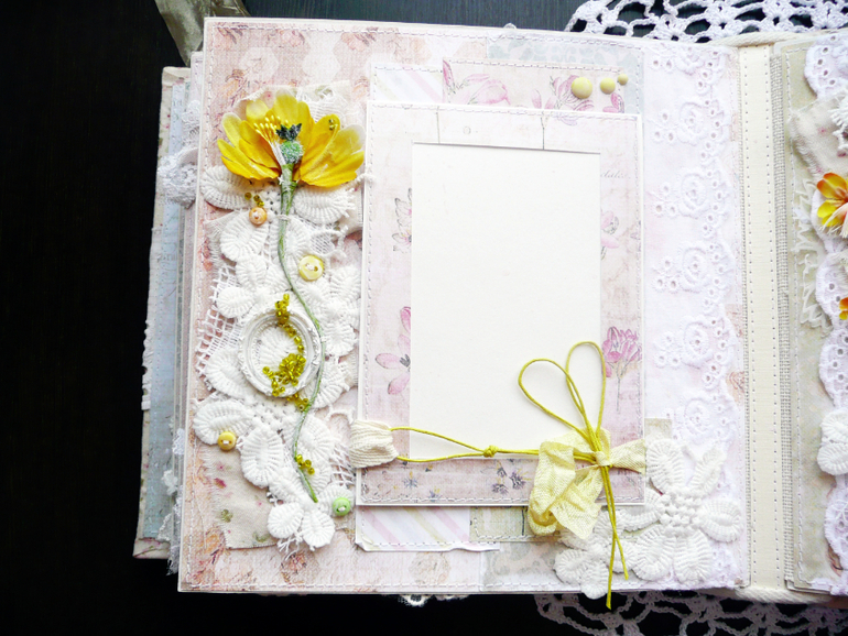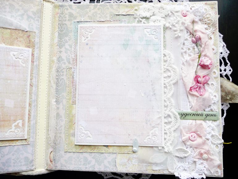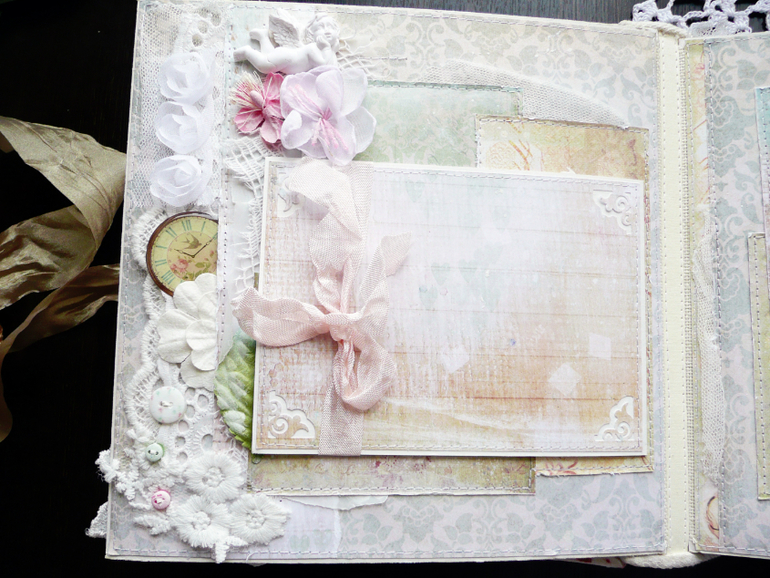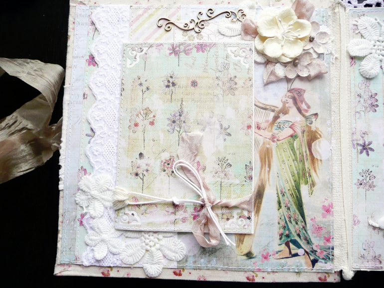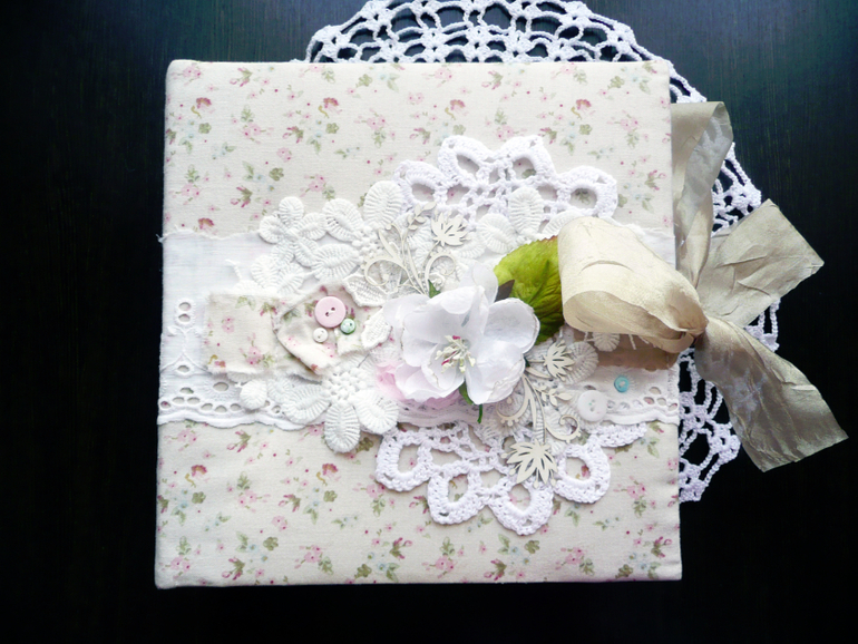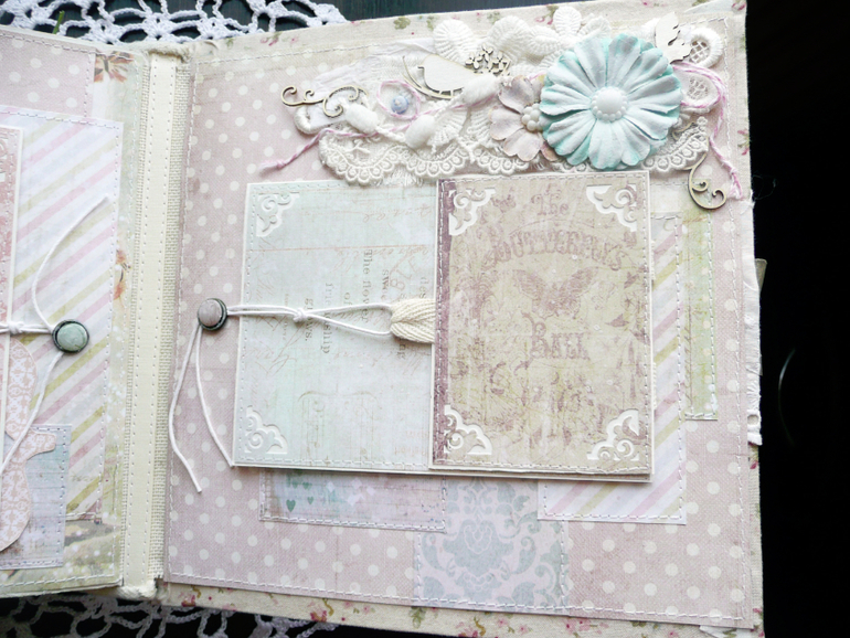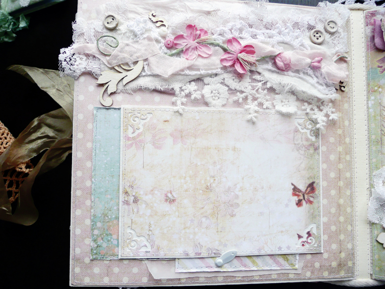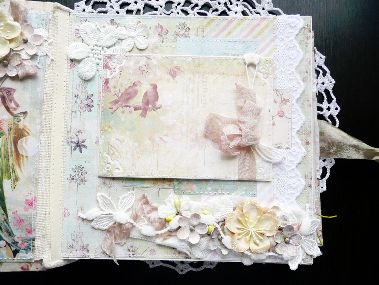 Очень красиво и нежно! Шикарный альбом получился))) Молодец, что доделала!!! Танюша-прекрасный учитель и вдохновитель! Единственное: я бы по желтым цветочкам акрилом прошлась....ярковат по сравнению с общей палитрой альбома. ...но это мое мнение. ...может фото цвет искажает
