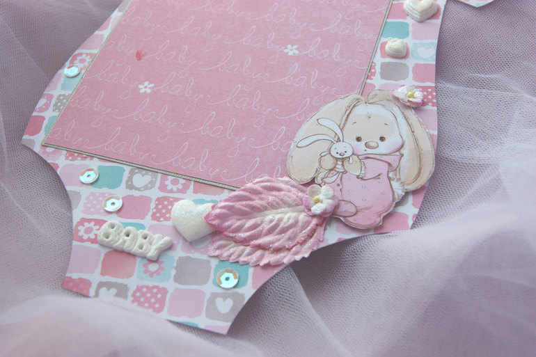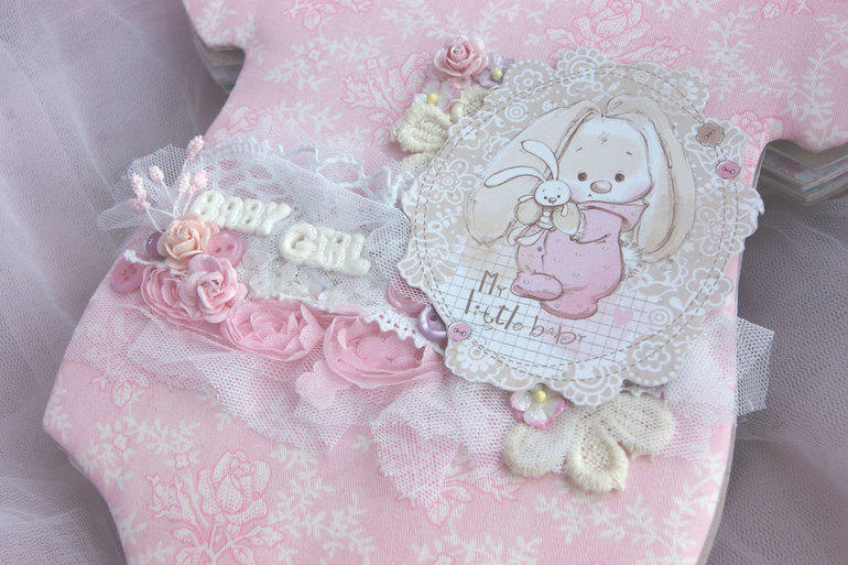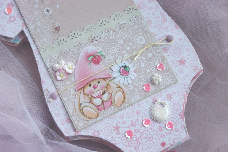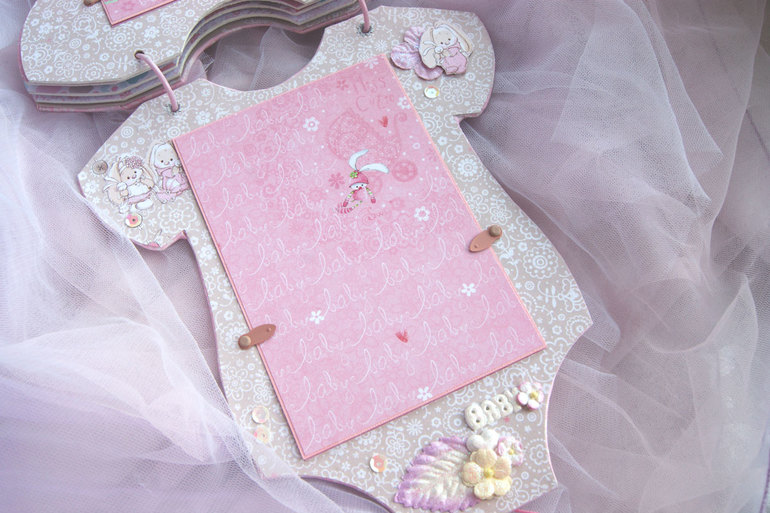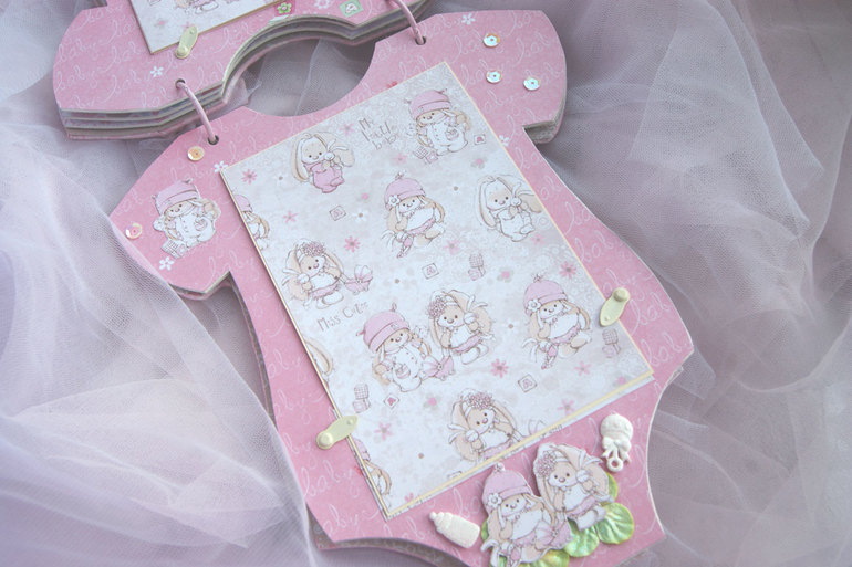 Далее немного фото того,как оформлен зайкин бодик внутри. В альбомчике есть раскладушечки для фото, поэтому вмещает 30 фото стандартного размера 10х15см. В декоре использовала пайетки (очень уж я их полюбила в последнее время-они так переливаются!