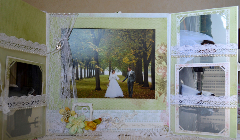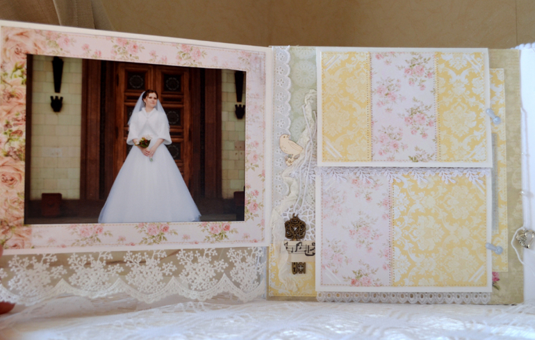 3 разворот. Просто красивое кружево и хорошие фото. Мне очень понравилось сочетание желтой флеровской бумажки и той же флеровской только с цветочками, на подложках для фото 10х15. Очень так свеженько и по-весеннему, мне кажется.
