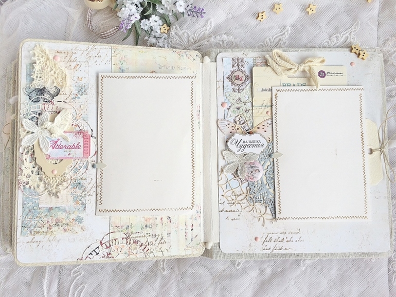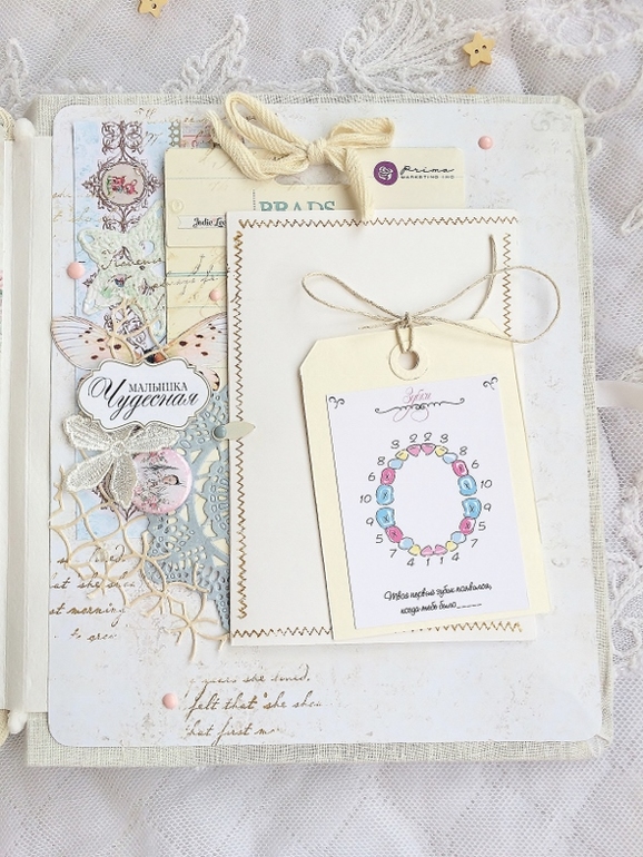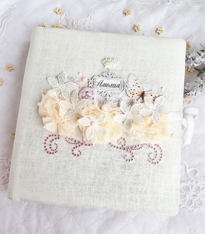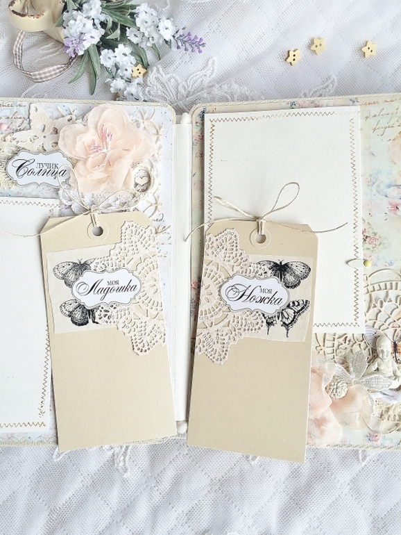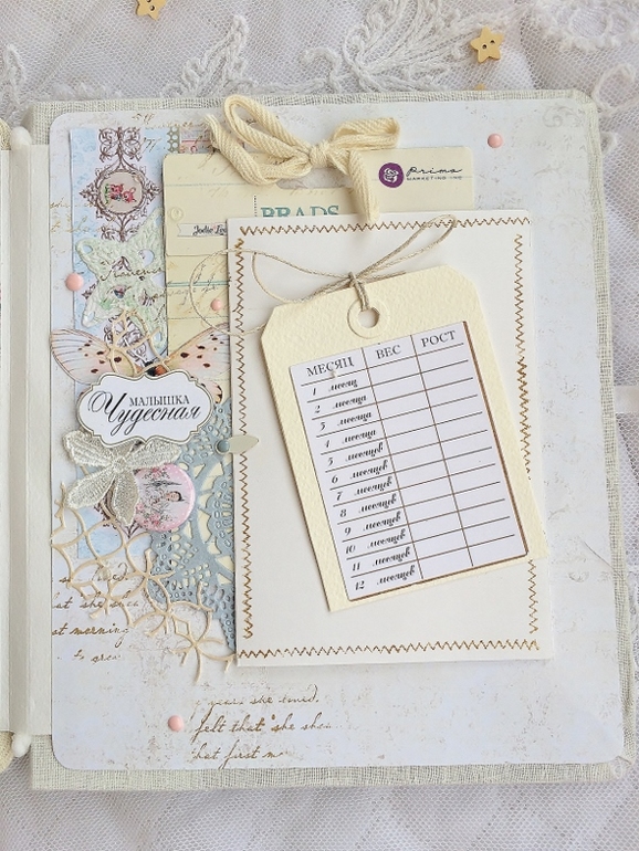 Супер!) расскажи, как так сделано, что страницы сам картон как будто тканью обтянут? И ещё....вот все эти тежики с метриками, они где спрятаны? Там какие-то кармашки в альбоме?