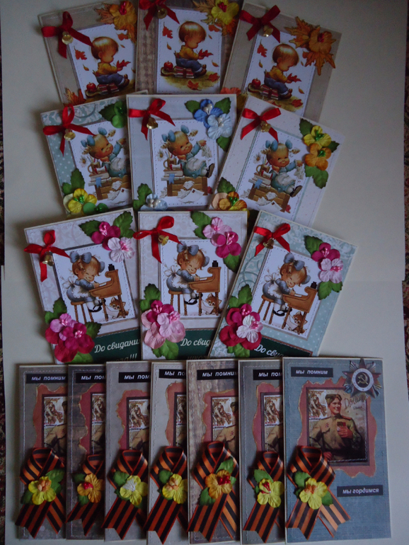 Открытки, приглашения, визиткиА все началось с открыток к 9 мая))( периодически в школах озадачивают-правда не всегда соглашаюсь)))И засели мы вчера с детками "потворить" и интересное кино как раз посмотреть да так увлеклись что захотелось еще и тут мама вспомнила что в закромах еще "школьные" распечатки есть-и работа закипела дальше).Честно сказать делая прям отдыхала да и давно такого тихого семейного вечера не было)Даже маленькая приняла участия малюя разводы акварелью для кленовых листиков.