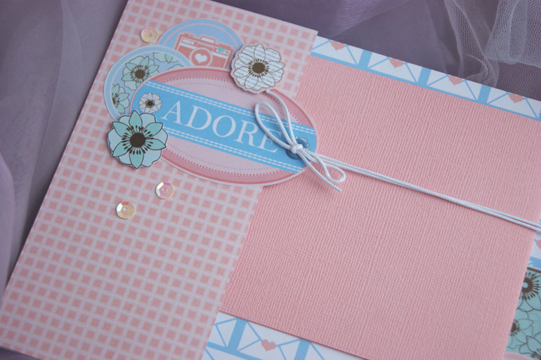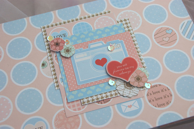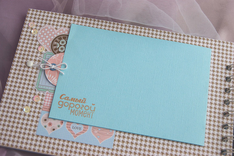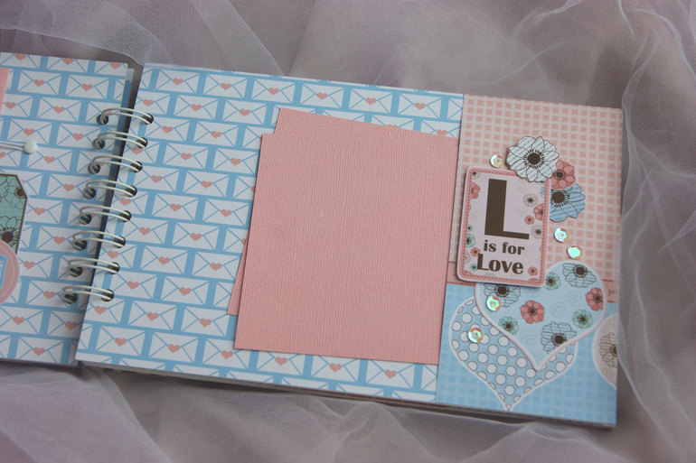 Делала в подарок (как и бодик с зайками) для своей подружки альбомчик на день рождение. Получился романтишный альбомчик на 5 разворотов в твердом переплете на пружинках.