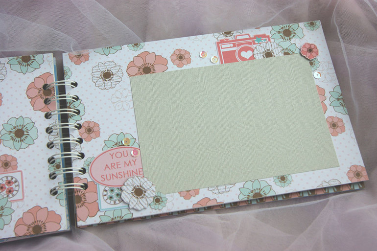В альбоме кармашки,раскладушки и карточки для фото. Размер альбомчика 15х23 см. По вместимости - 30 фото стандартного размера 10х15 см. Использовала 1 наборчик "You and Me" от ScrapBerry's, пивной картон для основы страничек и обложки, кардсток для подложек для фото и добавила немного любимых пайеток