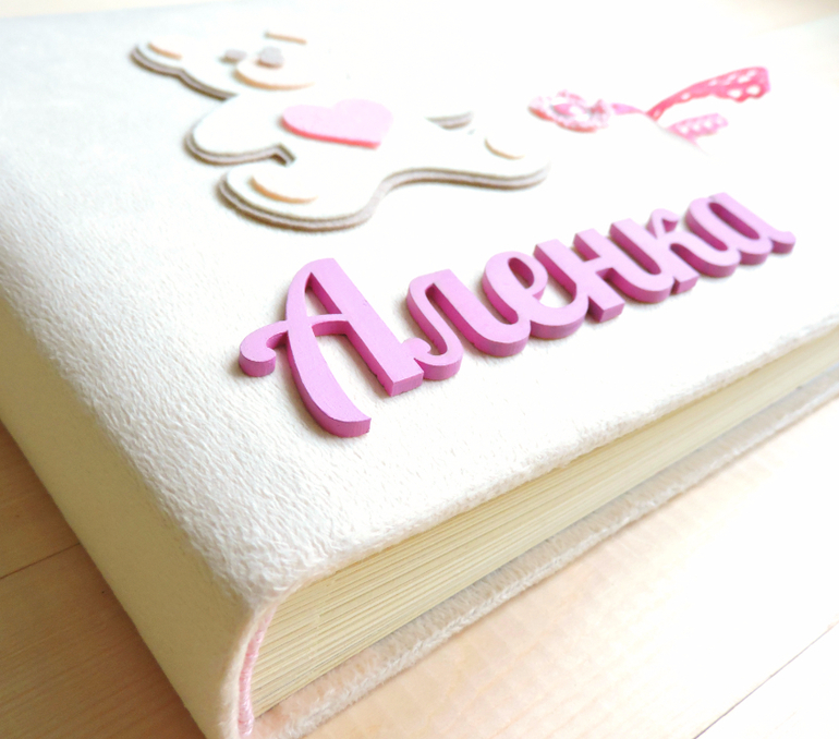 Альбом очень приятный на ощупь, нежный и мягкий, как плюшевый мишка. Размер альбома 20х20 см, в альбоме 40 листов из плотного дизайнерского картона, молочного цвета.