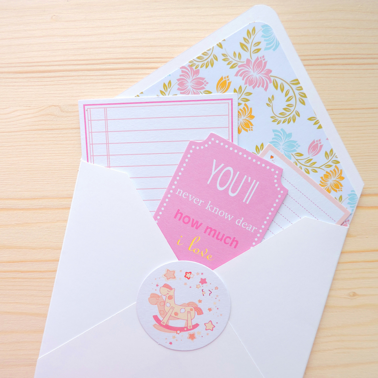 А также в комплект к альбому входит конвертик, в который можно вложить "письмо малышу в будущее". В нем Вы можете рассказать все то, что малыш еще не может услышать, он только пока чувствует Вашу любовь. Написать о радостях и трудностях, о Ваших планах на будущее, о характере малыша, его увлечениях и особенностях, а самое главное о Ваших нежных чувствах