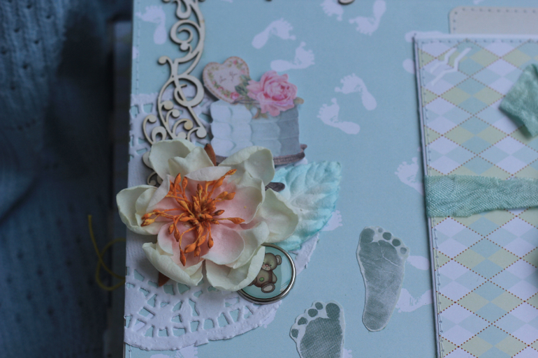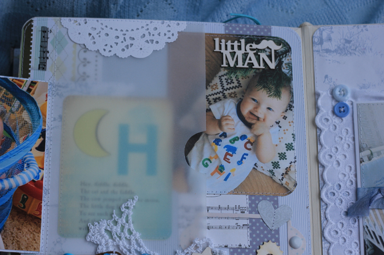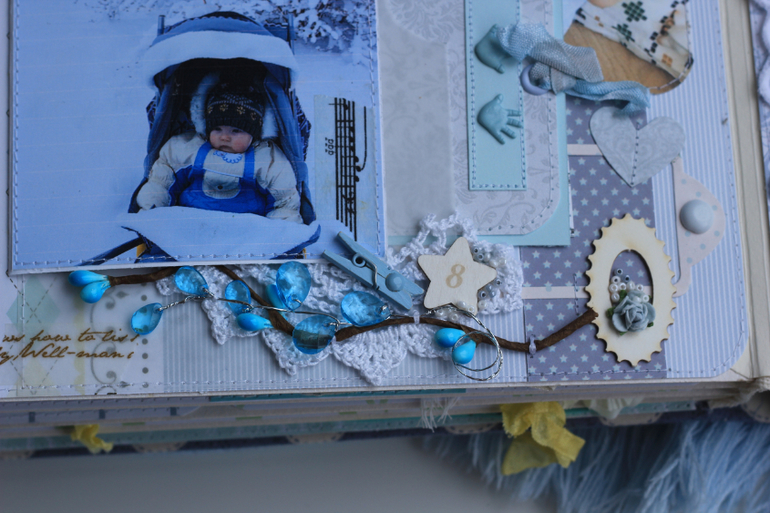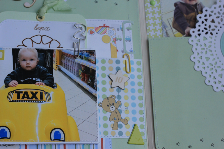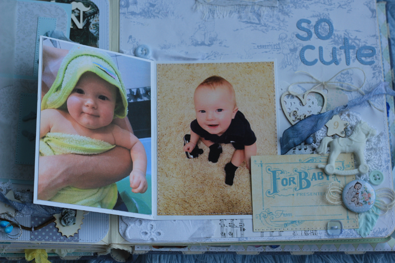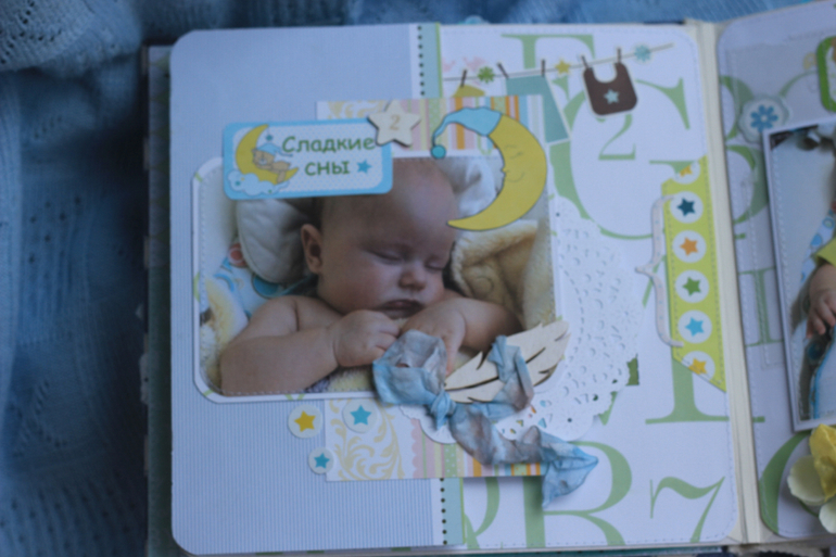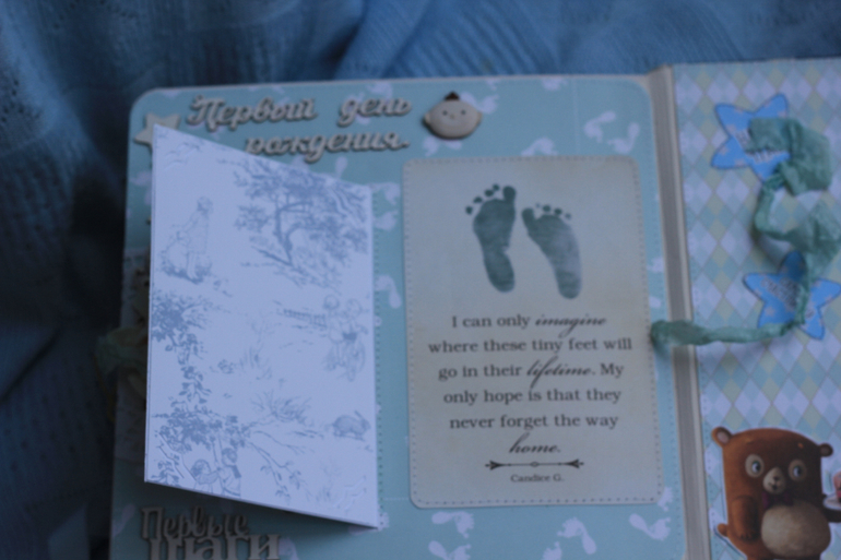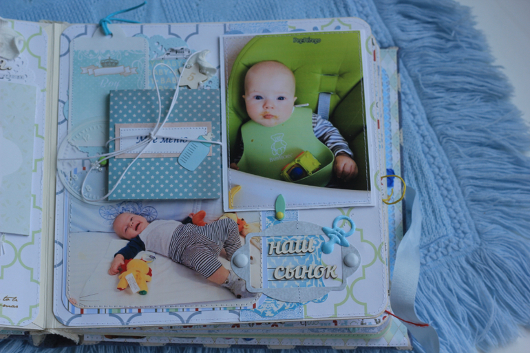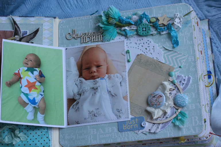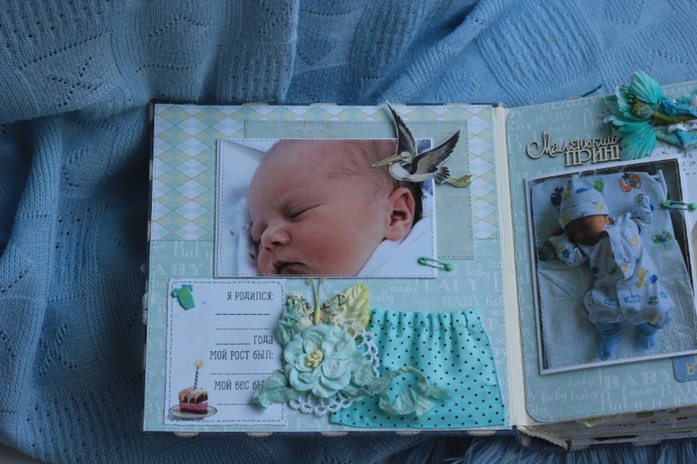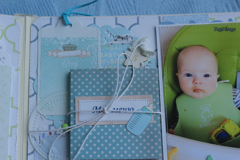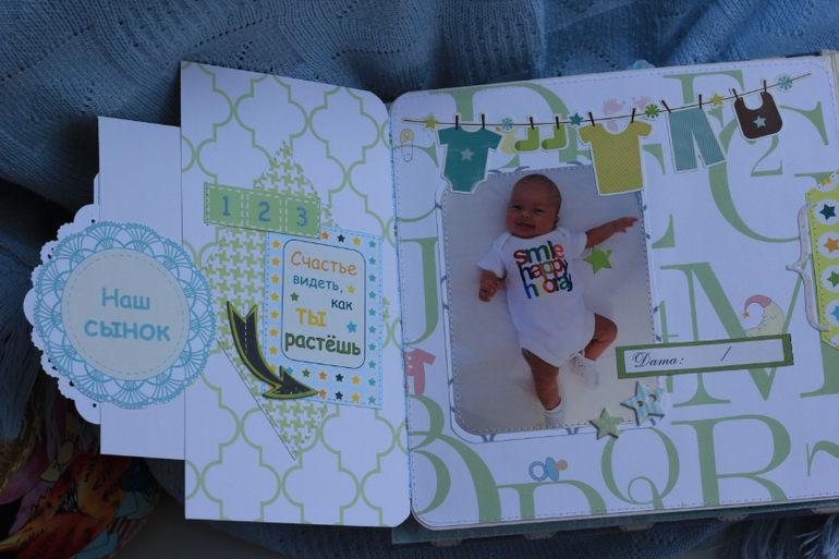 Первая страничка: Я родился! С кармашкем для бирочки, а еще под фото есть кармашек прозрачный для важных записочек или документов!