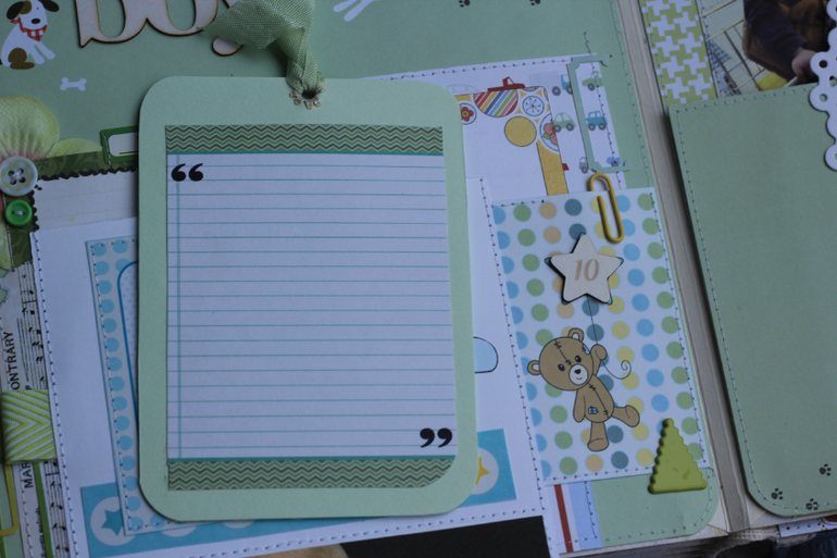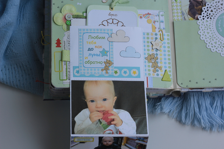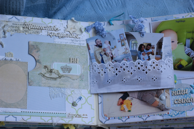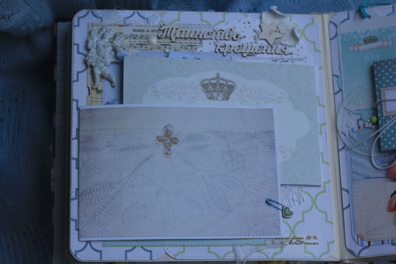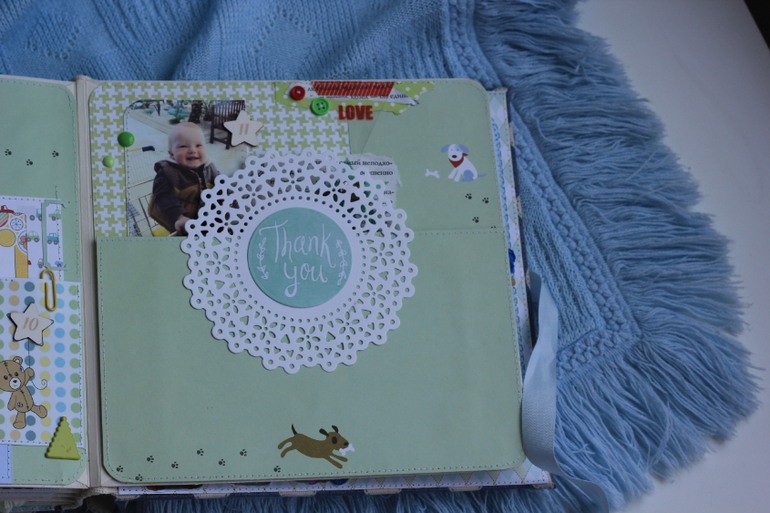 4-й месяц про крещеник: тут есть и тканевый кармашек для важный документов или доп фото, и места для записей,куда мама обязательно впишет и дату крещения и где оно проходило. есть доп.кармашек куда так же можно вставить еще фото. а на обложке этой странички разместилось фото с рубашечкой Феди!