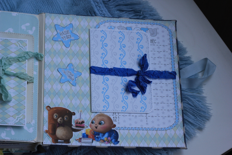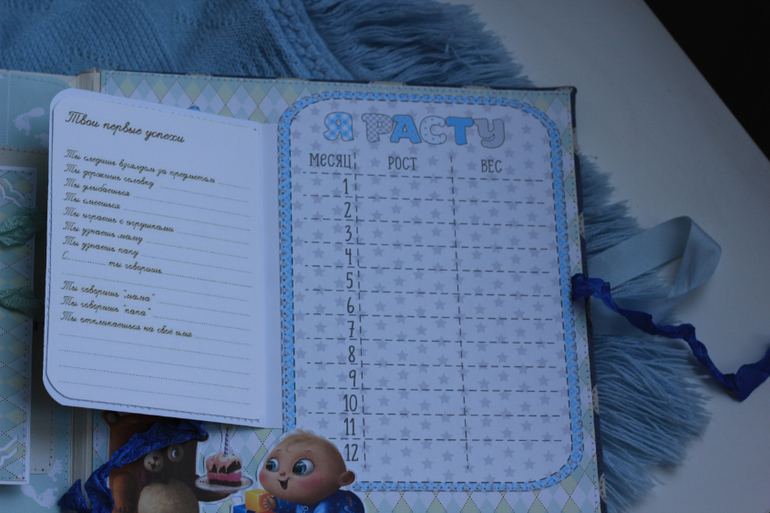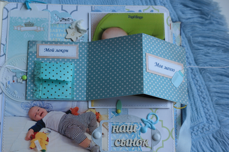 5- й месяц про первый прикорм. тут книжечка с пустыми страничками, куда можно вписать с чего Феденька начал прикорм, тут есть и кармашек для первого локона
