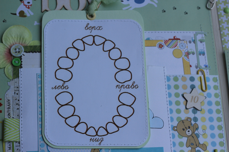 10-й месяц про юного таксиста и маминого помошника! и прол первый зубик. на обратной стороне карточки есть место для записи-как это дело было и даты.