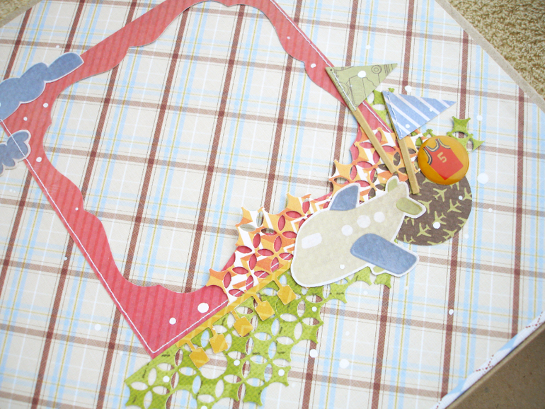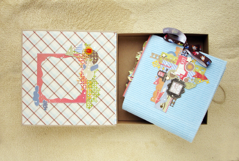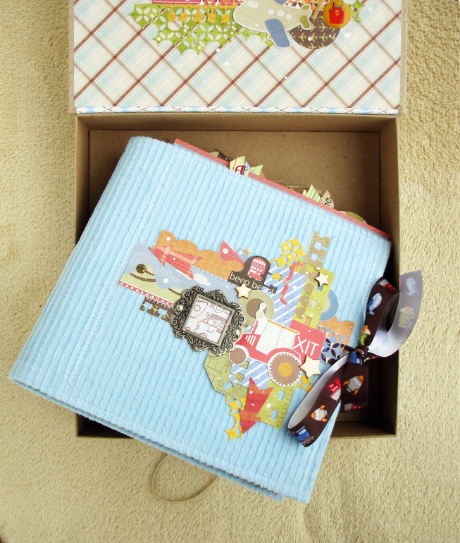Альбомы ДетскиеСегодня у меня альбомчик для мальчика. Давно хотела что-нибудь этакое соорудить, в альбоме нет стандартных подложек и уголков, фото вставляются под фоновый лист и "выглядывает в окошке". В альбом помещаются фото размером 10х15 - 14 штук , фото 10х7,5 - 4 штуки. В рамку на обложке можно добавить имя обладателя! Переплет на пружине, а так хотелось текстильную обложку, пришлось подумать! Лента на завязки пролежала у меня лет 5, так понравилась мне сначала, а потом никуда не пристраивалась. Настал ее час. На альбом у меня ушли практически все остатки от набора 30х30 плюс набор 15х15 от Kaisercraft Little Toot. Правда, остались натирки, наклейки и лист для вырезания.