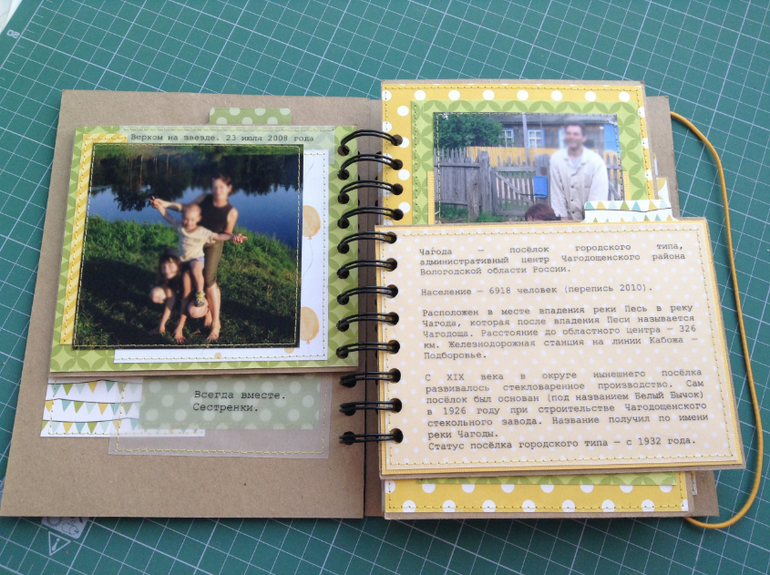 Альбомы СемейныеНа самом деле мой первый альбом формата 30 на 30 лежит в кладовке и ждет своей очереди на доделку-переделку. А это первый доделанный альбом для племянницы моей подруги. Альбом семейный, посвященный месту, где жили бабушка и дедушка. Не совсем довольна обложкой, наверное, с нее надо было начинать. Я ее сделала последней, когда бумаги почти не осталось :) Бумага Echo park и Polkadot.