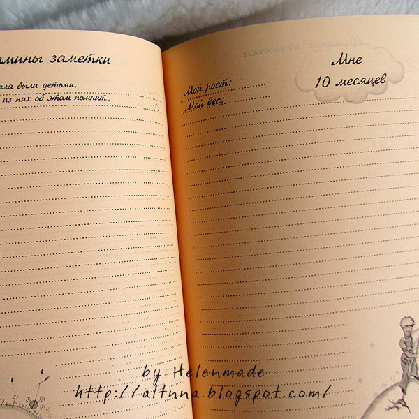 БлокнотыЯ сегодня решила показать вам все непоказанное)))). Мамин дневничок с очень красивыми иллюстрациями корейского художника Ким Мин Джи ко всем известной сказке Маленький принц. Формат дневничка А5, 150 листов в линию с цитатами из этой сказки, тематические разделители. Застежка- магнитная кнопка, закладка.Много кармашков)))),в блокноте также есть тематические листы для записи данных при рождении малыша, достижений, отпечатка ладошки и ножки, первых каракуль крохи, смешных фраз.