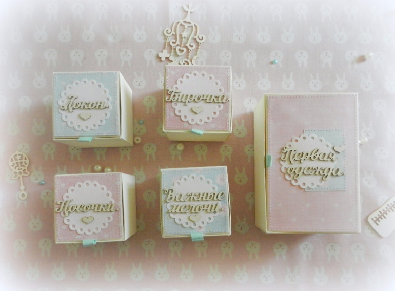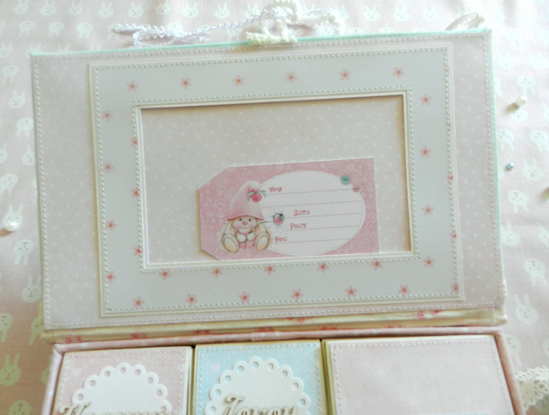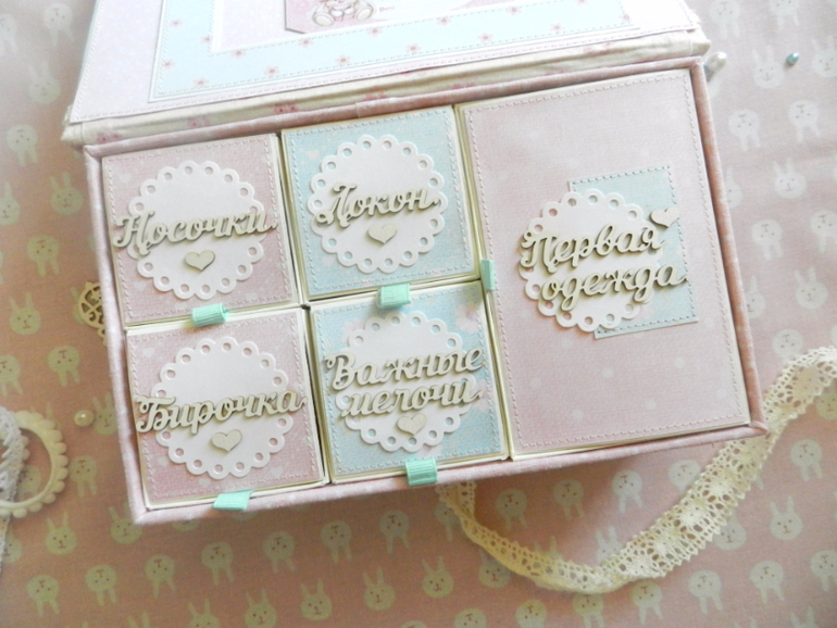 Шкатулка в себе содержит 5 коробочек для различных вещей. Вообще они могут быть любые, тут для малышки всё подобрано:) Сама шкатулка полностью обтянута тканью: и крышечка, и основание - в итоге она получилась очень добротная. Почти все детальки прошиты для прочности и просто в качестве декора.