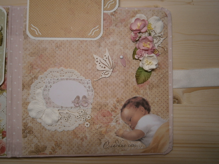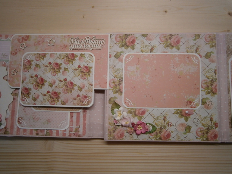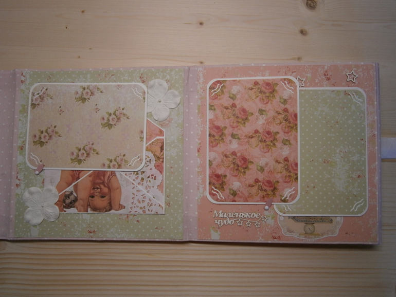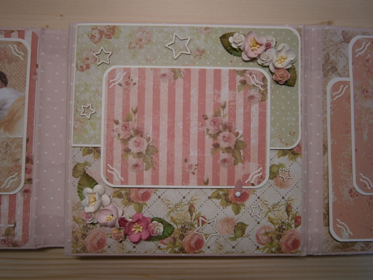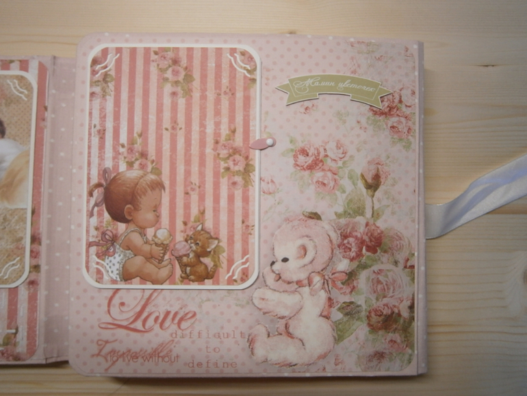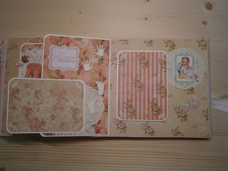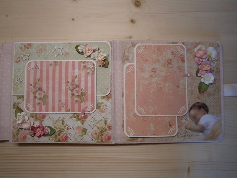 Формата он 20Х20 см и, можно сказать, что он выполнен на четыре разворота, но, говоря проще, в нём восемь страниц. А вмещает в себя 42 фотографии. Бумага от фирмы ScrapМир, коллекция "Карамель". Пока что, оба моих девчачьих альбома сделаны именно из бумаги от фирмы ScrapМир, уж больно нравятся мне их девчачьи коллекции.