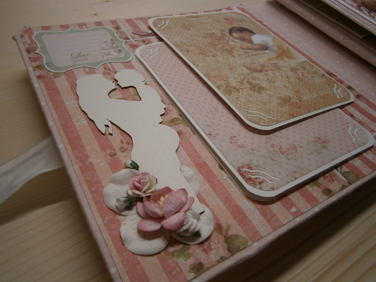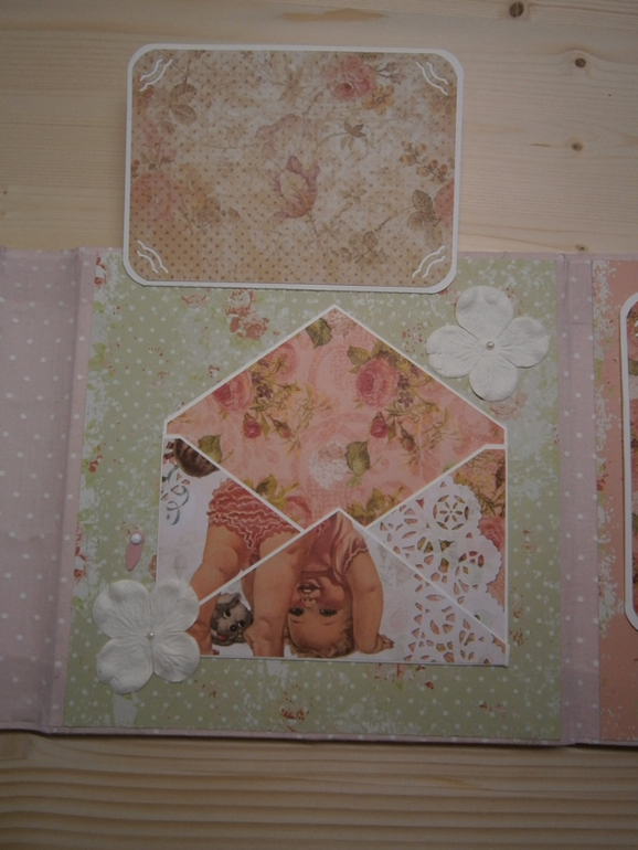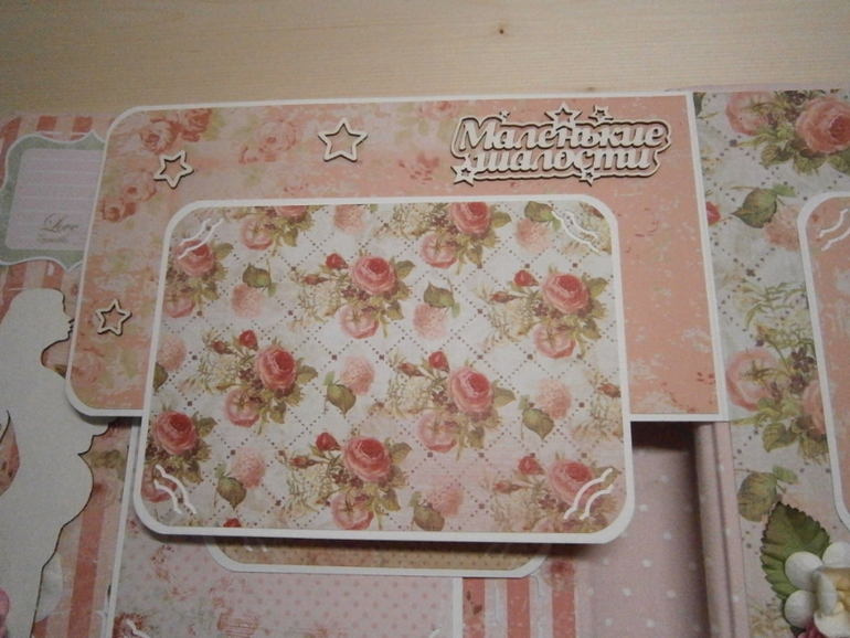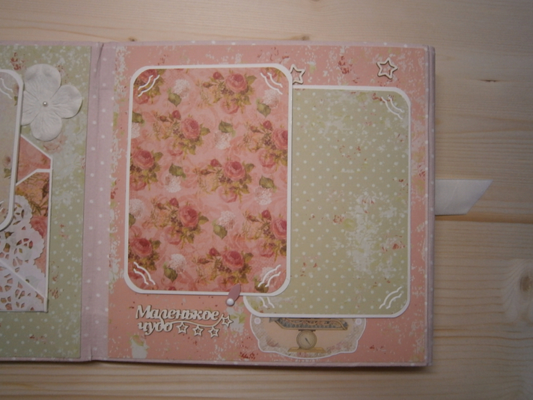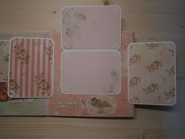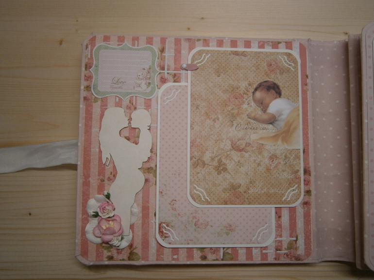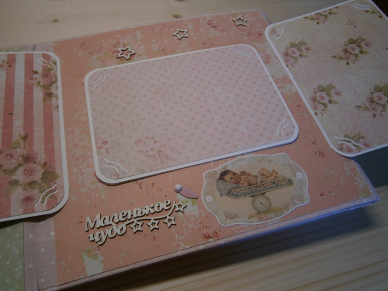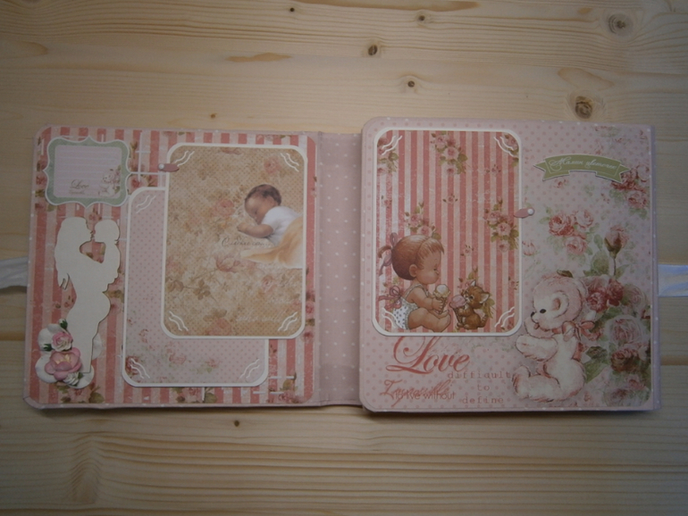 Формата он 20Х20 см и, можно сказать, что он выполнен на четыре разворота, но, говоря проще, в нём восемь страниц. А вмещает в себя 42 фотографии. Бумага от фирмы ScrapМир, коллекция "Карамель". Пока что, оба моих девчачьих альбома сделаны именно из бумаги от фирмы ScrapМир, уж больно нравятся мне их девчачьи коллекции.