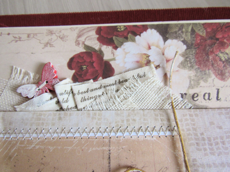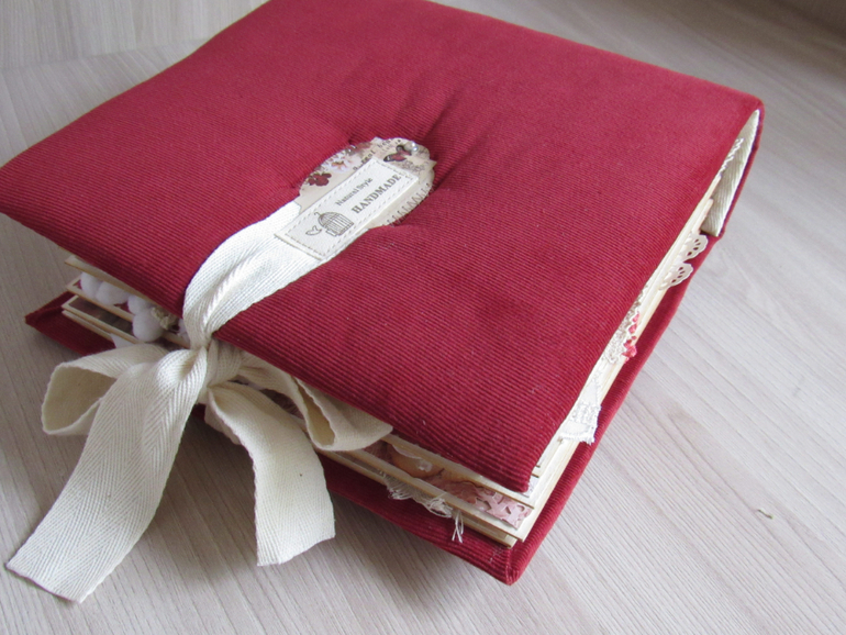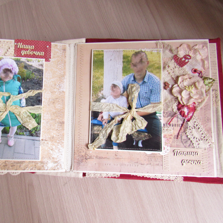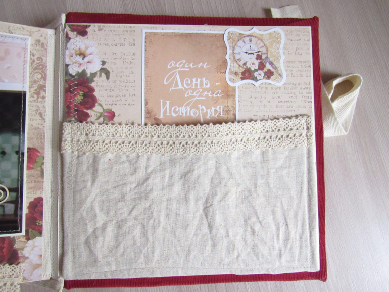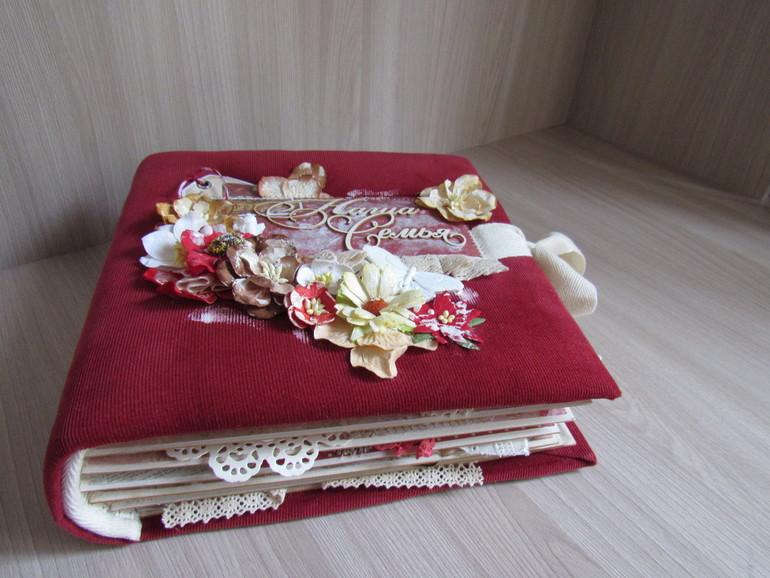Формат 20х20. 6 разворотов, 12 страниц. Мягкая обложка из очень красивого бордового микровельвета. Переплет тканевый прошитый по МК С. Ковтун. Альбом вмещает более 20 вшитых фото. На первой странице расположился бумажный конверт для дополнительных фото или памятных записок) На последней странице - текстильный карман из натурального льна - тоже под доп фото)) В декоре использованы хлопковое кружево, натуральный лен, хлопковая тесьма, чипборд, пластиковые украшения, высечки, и много всего остального)) Альбомчик получился очень уютным и семейным. Смотрим))