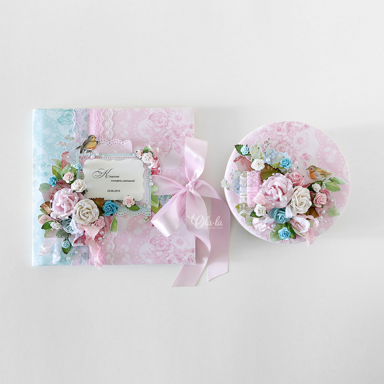 Книга 21*21см, внутри 30 листов плотной (120гр) бумаги, молочного цвета. Листочки чистые, свобода для творчества каждому гостю)) и шкатулочка 14см в диаметре и высотой 5см.