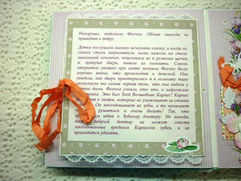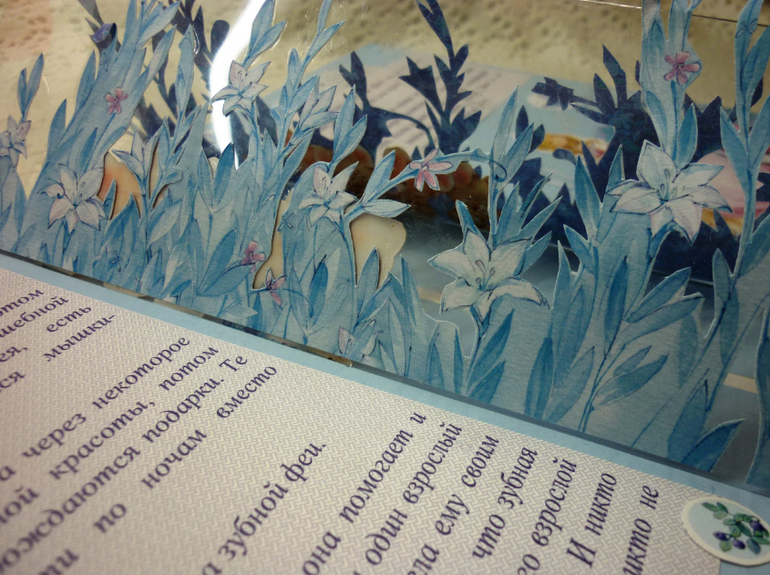 А я сегодня с необычной работой. Поступил мне заказ на альбом-книгу, в котором будут собраны три рассказа про "Волшебных Зубных феечек". Долго думала какой же он будет и решила, что в основе попробую сделать альбом по прошлогоднему СП "Интерактивный альбом" от блога Мухи творчества. Альбом размером 20х20, твердый переплет, мягкая обложка и 6 разворотов, получилось по два разворота на каждый рассказ. Бумагу использовала от ScrapBerry's коллекция "Волшебная страна", которая идеально подошла к теме книги, там же есть лист с верзалками где много прекрасны феечек.