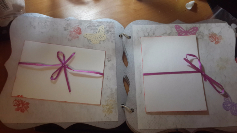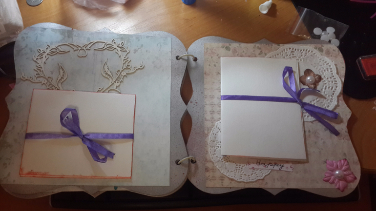 Первая страничка первого фото - для записей пожеланий. Последнаяя страничка последнего разворота - конвертик.