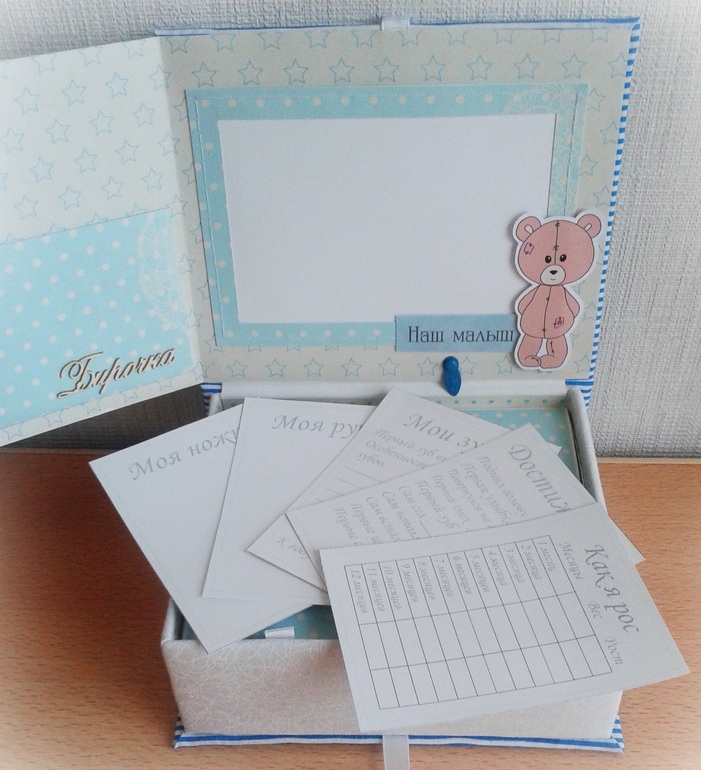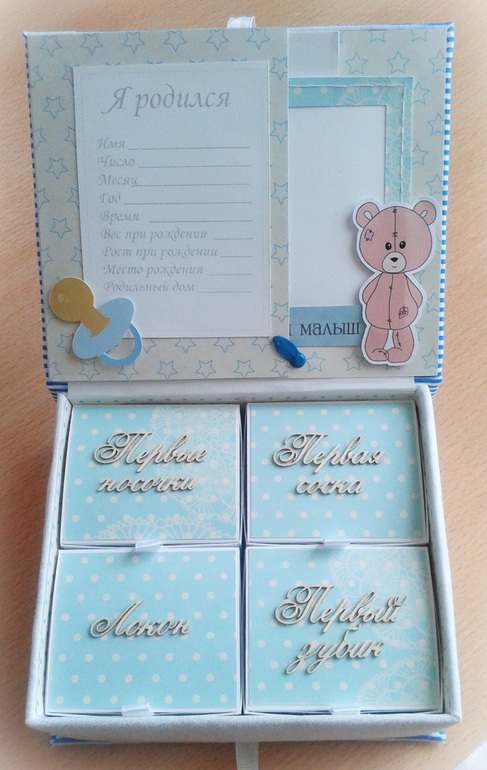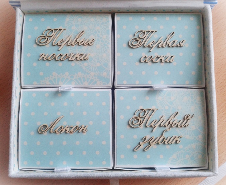 Внутри четыре коробочки: первый локон, первый зубик, первая соска и носочки. А также есть кармашек для бирочки.