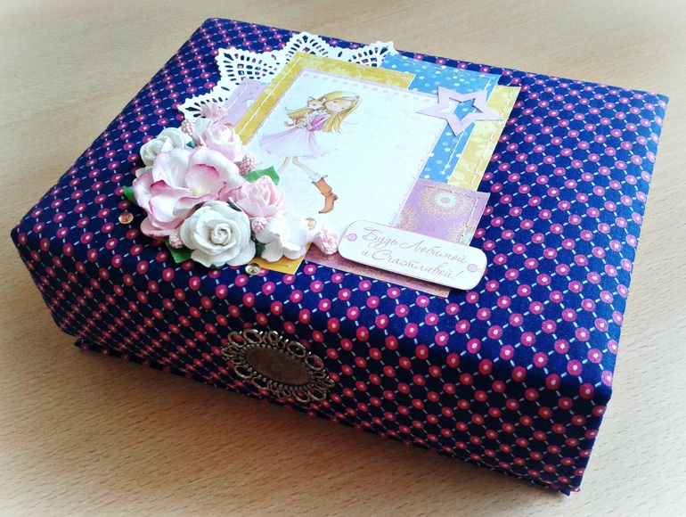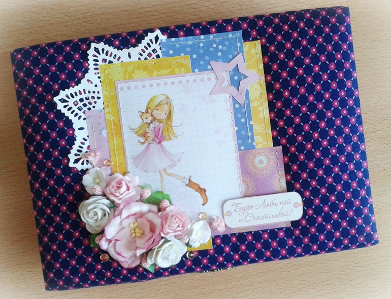 Размер 21 х 15 см, обтянута натуральным хлопком (кстати, тканюшка эта из бабушкиного сундука))) Когда увидела ее, просто влюбилась!). В работе использована бумага от Scrapberrys коллекция Подружки, вырубная салфеточка и много цветочков: