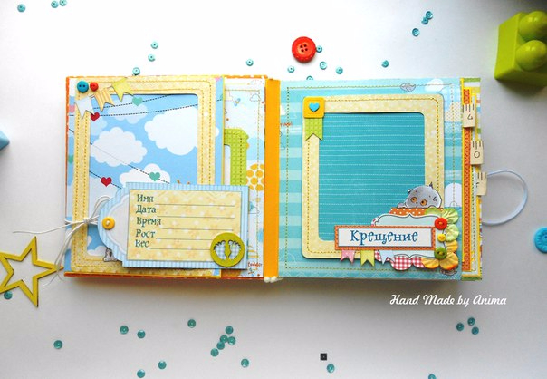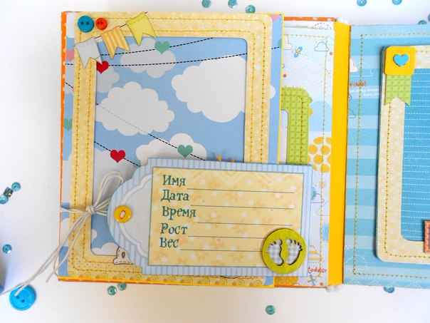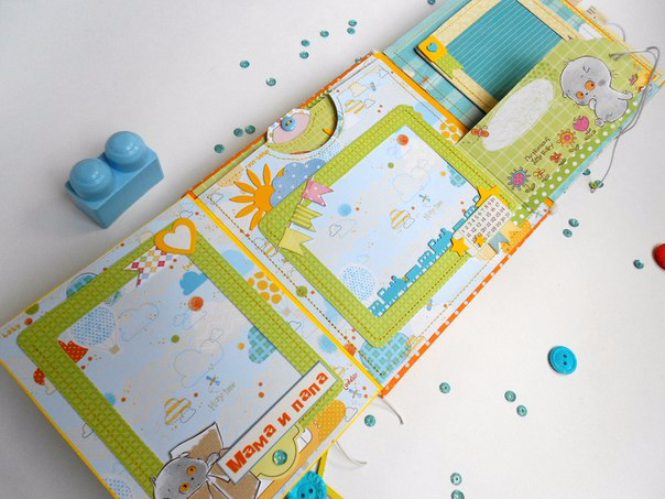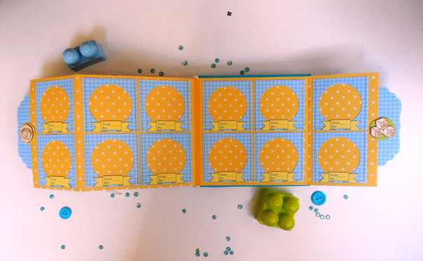 И четвертый разворот. 12 фото с флажочками для записи роста и веса малыша в течение первого годика.