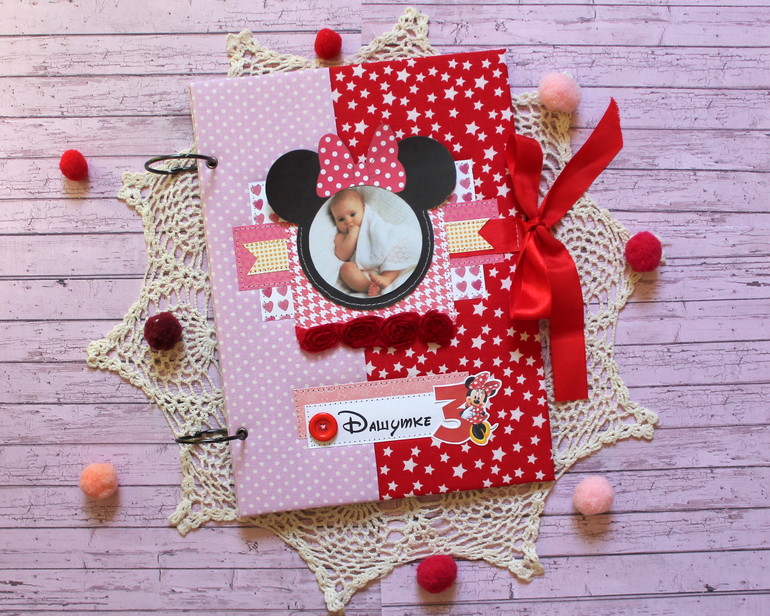 Формат А4, внутри буду коллажи из фото, которые мамочка будет хранить в файлах. А в Мини Маус
