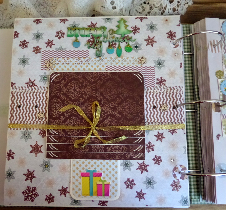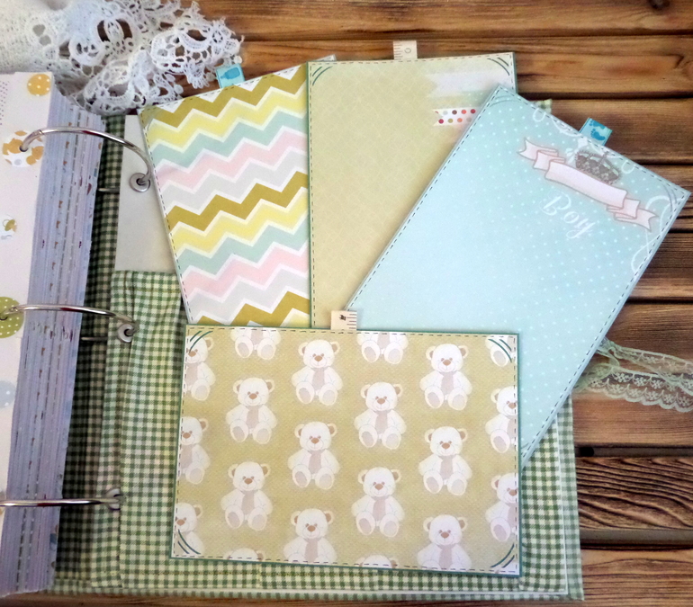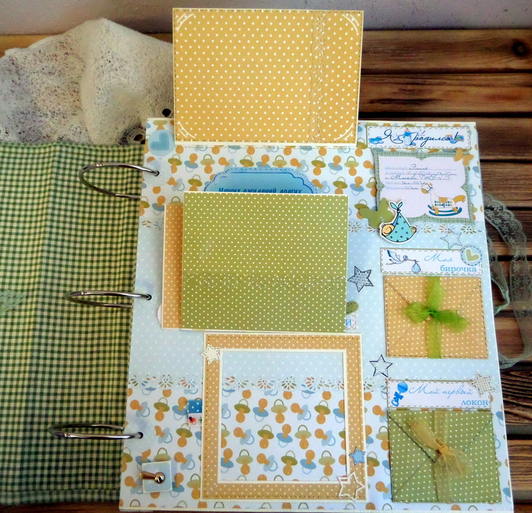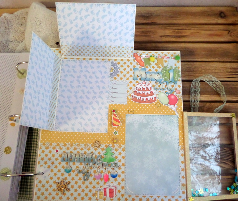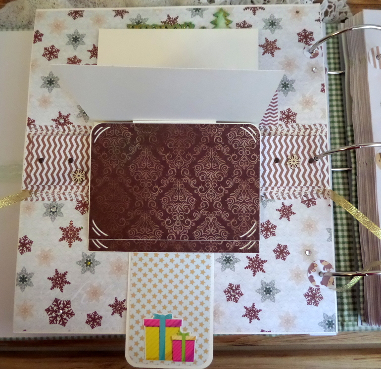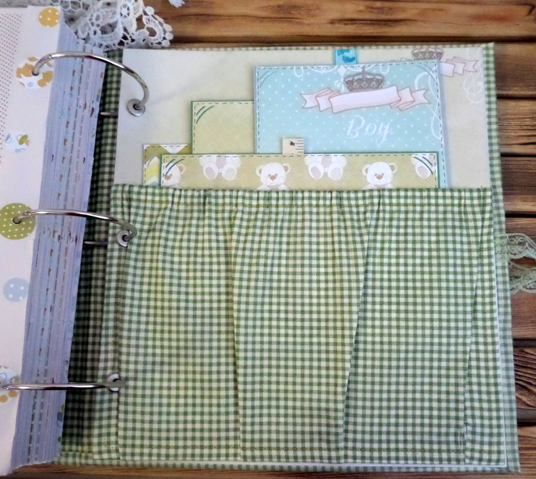последний форзац с объемным тканевым кармашком, в котором карточки для больших фото (они появились, пока я делала альбом)))