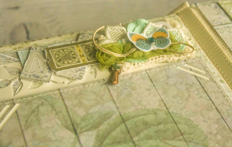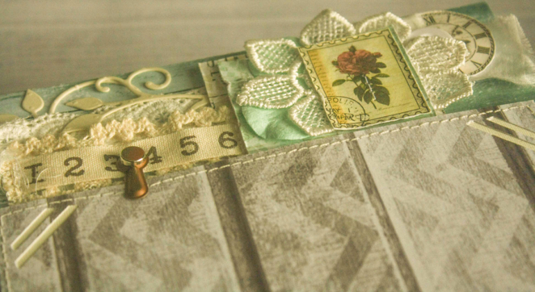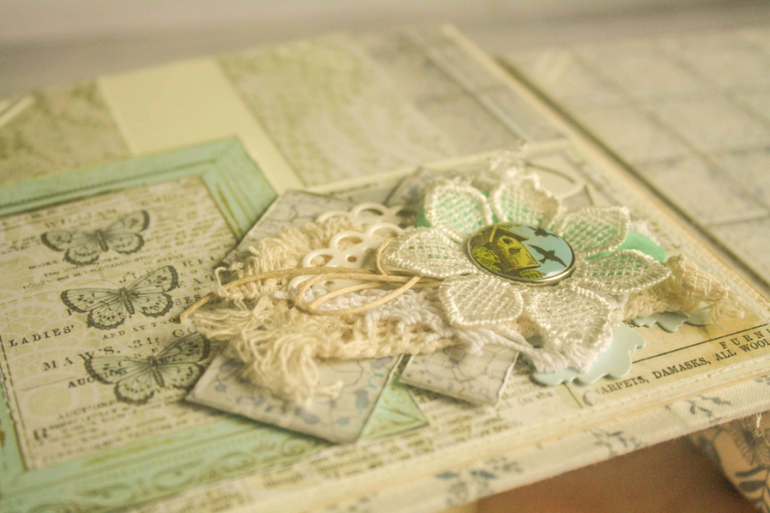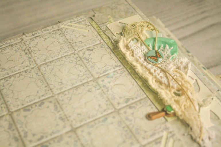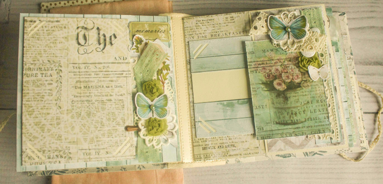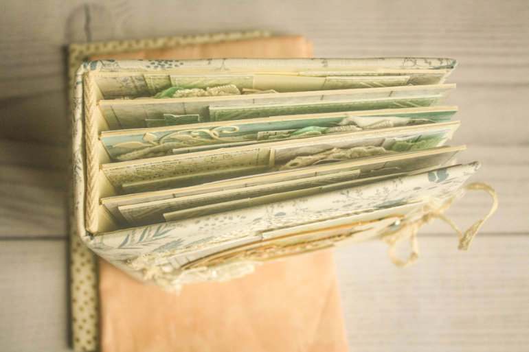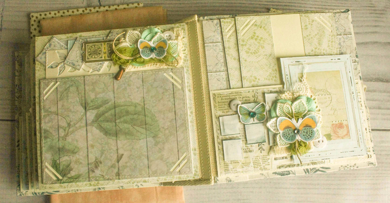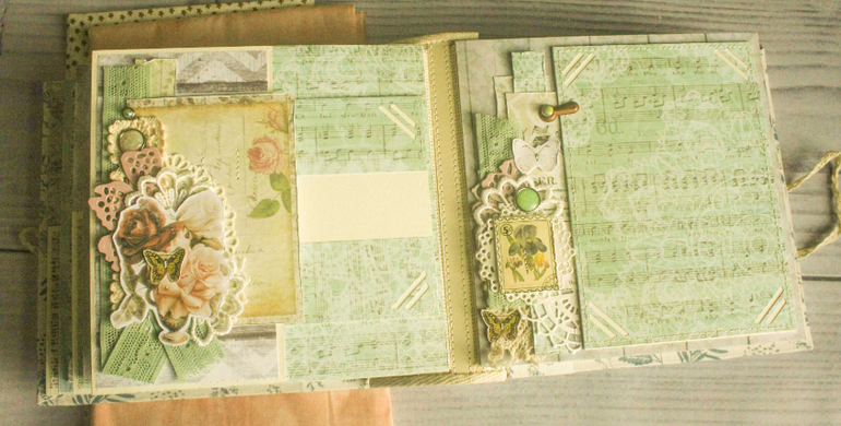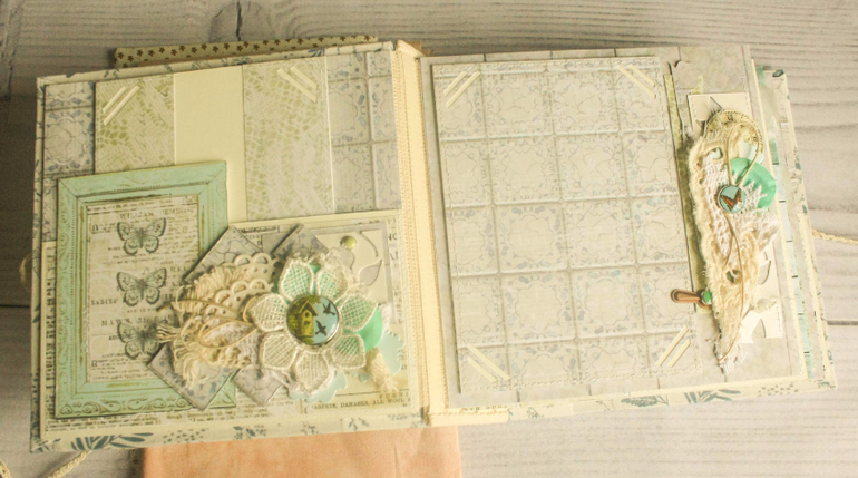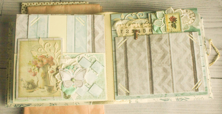 Формат альбомчика всего 16 на 16 см, пять разворотов для фотографий 9х13. Ручной прошитый переплет, мягкая тканевая обложка. На каждом развороте на одной страничке - раскладушка на 3 фото, а на другой - карман с подложкой для фотографий, в который можно поместить не только фото, но и какие-нибудь маленькие памятные штучки.