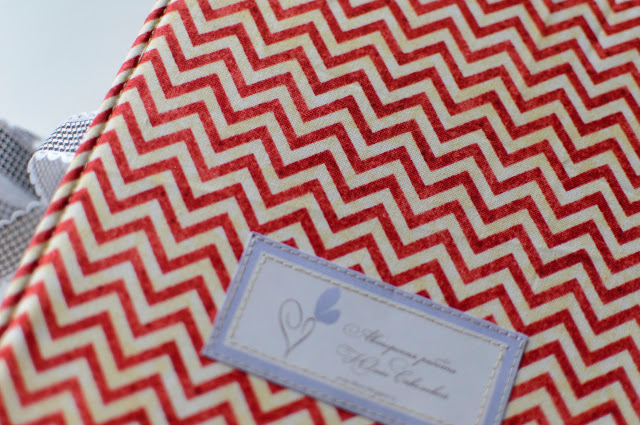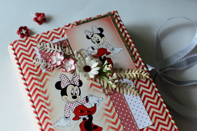 Обложка из комбинированной ткани. Орнамент на ткани "переходит" на фотографию с Минни..