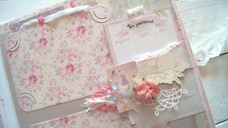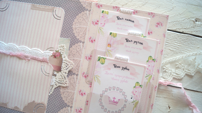 Альбом состоит из 5 разворотов, размер страничек 23х26, вмещает 26 фото форматом 9х13. В альбоме есть кармашек для бирочки, конверт для локона. Есть карточки для записей о росте и весе, зубках, достижениях.