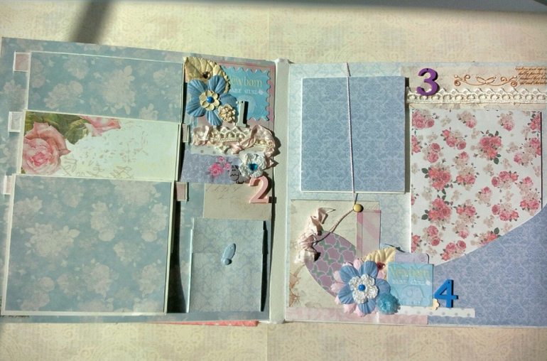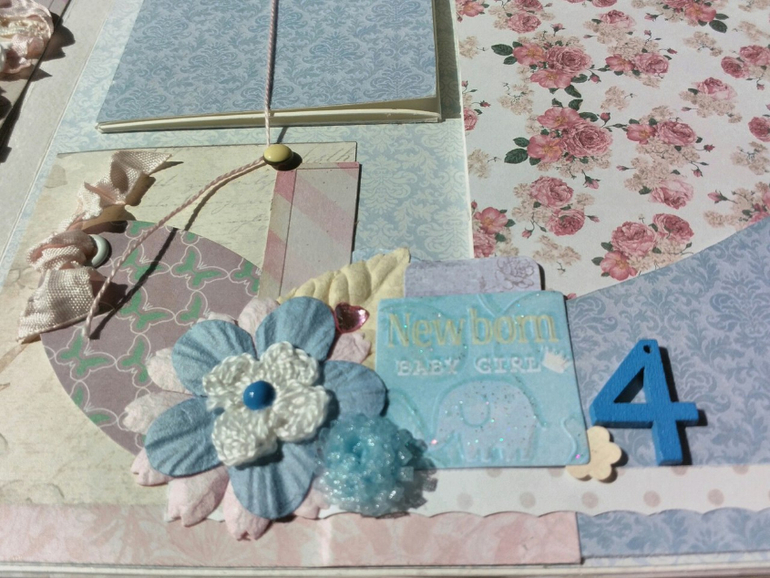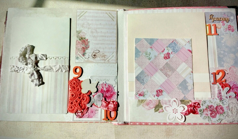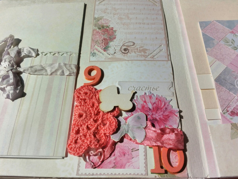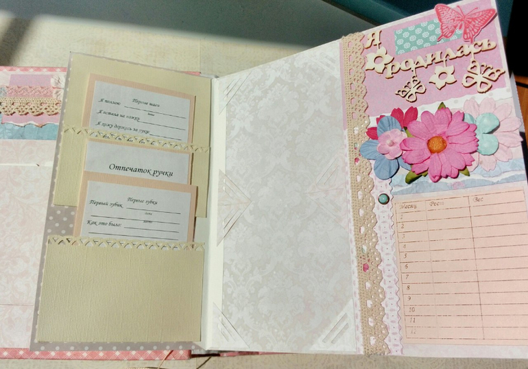 Но я очень рада что он наконец-то закончен. Альбом на первый год жизни, по месяцам. Есть развороты не пронумерованные, кармашки для дополнительных фото, карточки роста и развития, кармашек для бирочки. Для декора также использовала вязаные элементы.