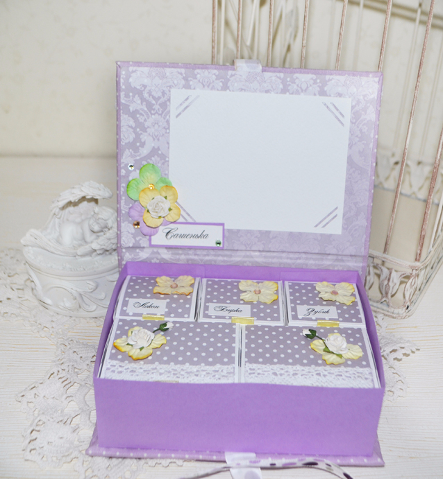 Внутри 5 коробочек:две без названия ,для локона,зубика и бирочки из роддома.![]()