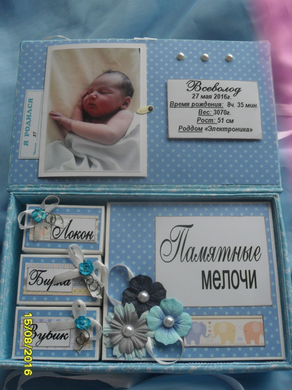 Заканчивается жаркое лето, а с ним и мой отпуск. Скоро на работу. Поэтому стараюсь побольше успеть сделать разных Скрапушек. Сейчас хочу поделиться с вами своей очередной работой. Сокровищница выполнена на заказ для маленького мальчика Всеволода. Заказчица попросила, чтобы цветовая гамма была нежно-голубая и использовались различные украшения. Обычно я стараюсь минимум украшалок лепить на сокровищницы, но в этот раз пожелания мамочки я выполнила.