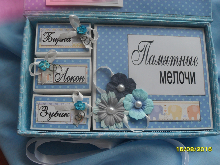 Внутри 3 маленькие коробочки: "Зубик", "Локон", "Бирка" и побольше коробочка "Памятные мелочи"