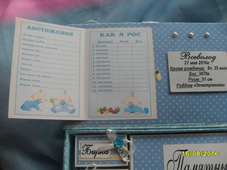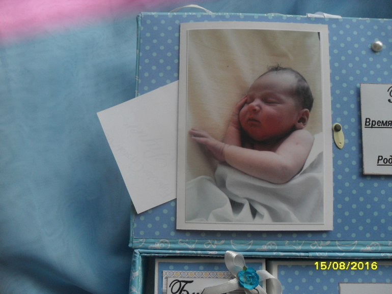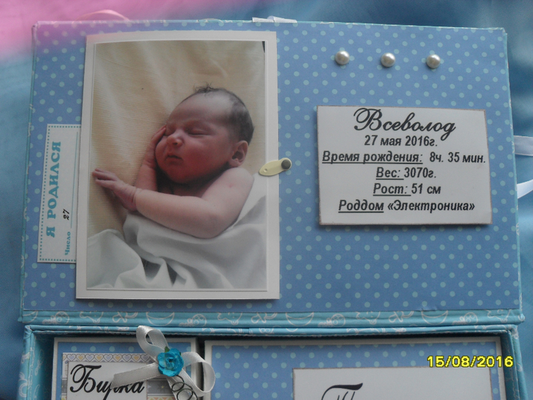 Под фотографией спрятан потайной карман для фотографии УЗИ, но сейчас я там припрятала один из вариантов метрики, чтобы заказчица смогла сама выбрать.