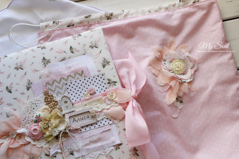 Альбомчик будет храниться в нежном мешочке, который я сшила из тех же тканей, что и на обложке альбома.