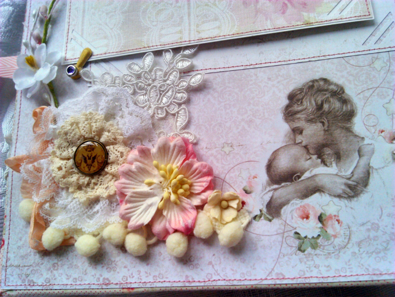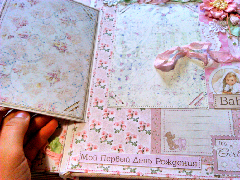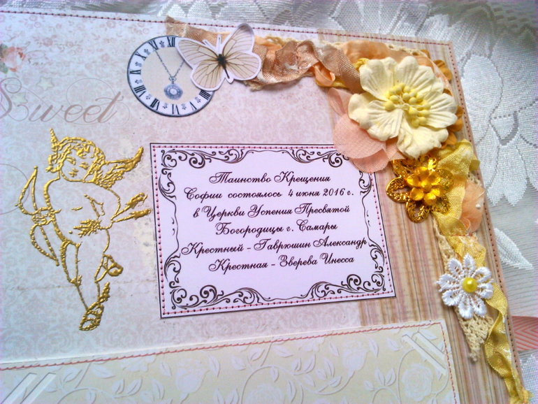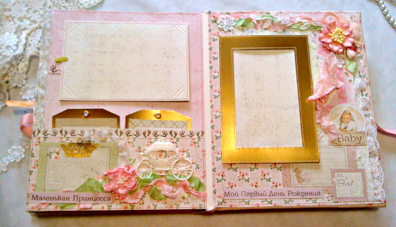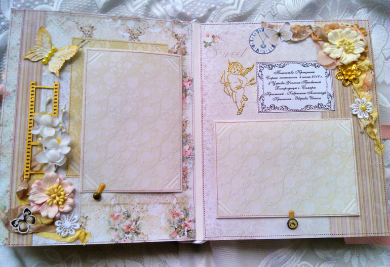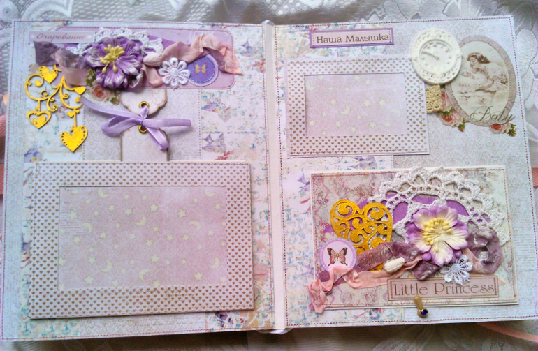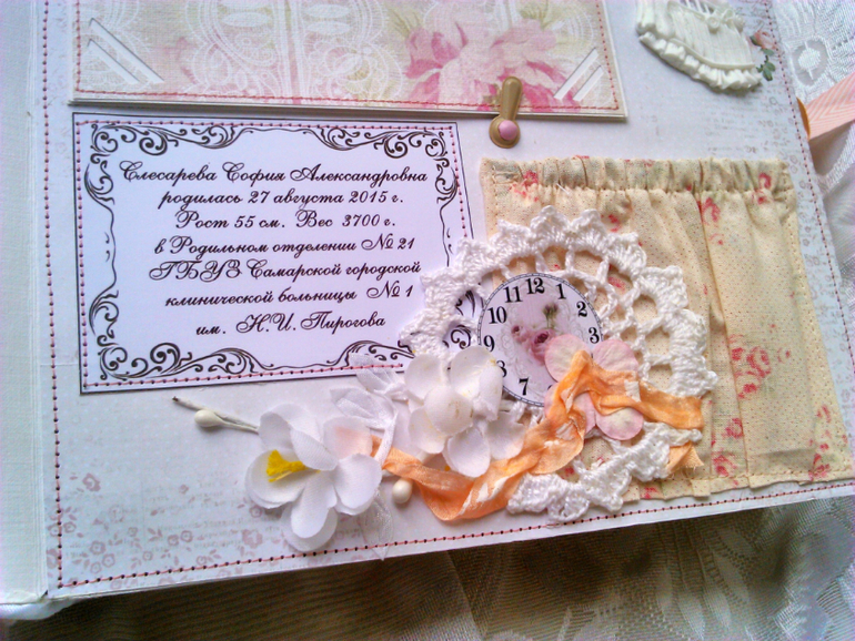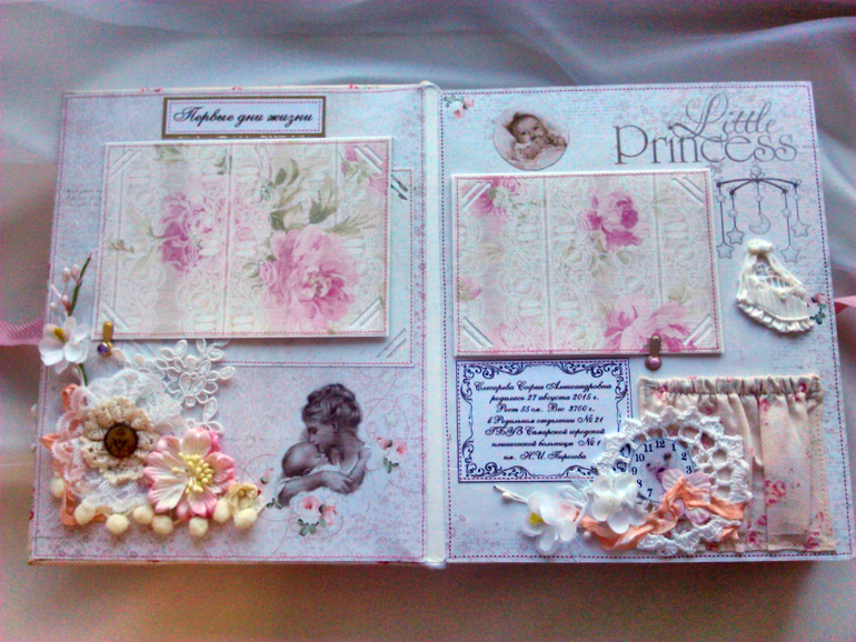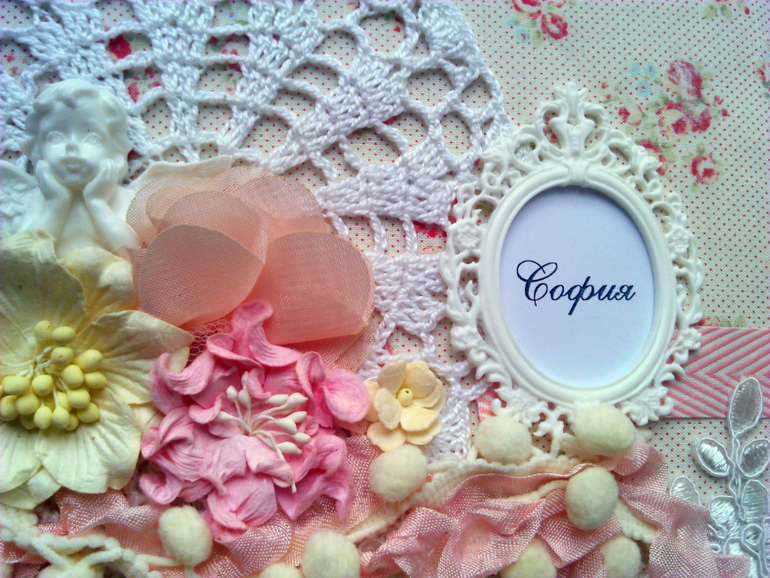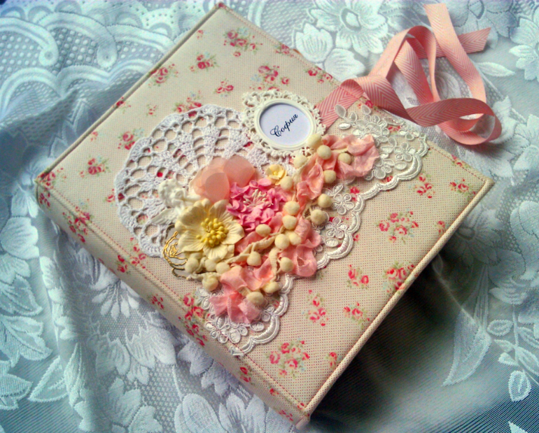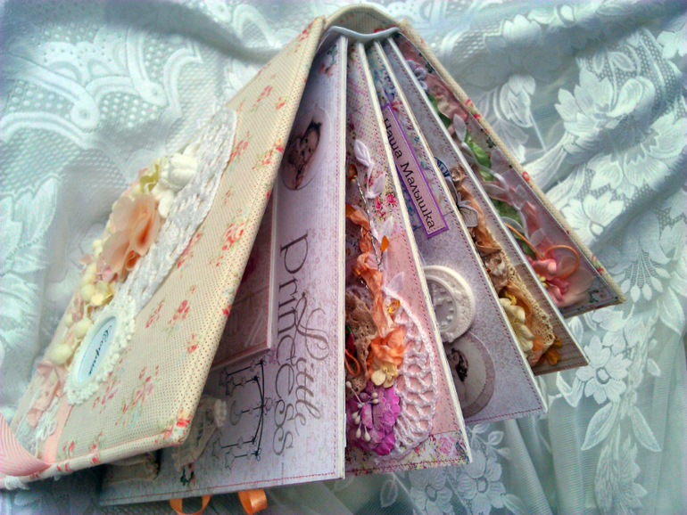 Удивительно, но все альбомы, которые попадались мне в интернете для малышек с таким именем почему-то отличались особой зефирностью и воздушностью. Вот и мой тоже попадает в эту серию во многом благодаря салфеточкам ручной работы, создававшимся индивидуально для этого альбома. Размер 21*26 см, вмещает более 30 фотографий формата 10*15. Много писать не стану, приглашаю к просмотру!