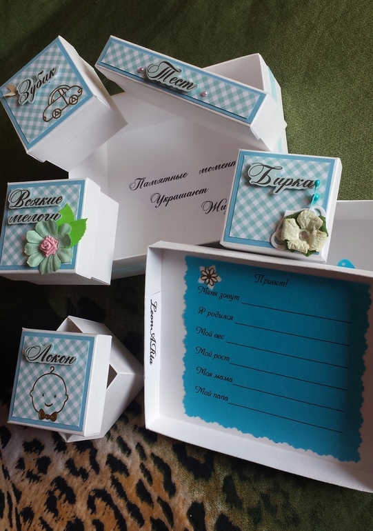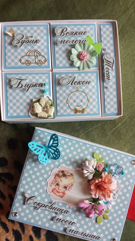 Коробки, шкатулки, комодыНачать движение в ВВ решила с маминой сокровищницы. Девочки- скраперы знают, что это такое,каждая создавала хоть раз такую коробочку. У меня в этот раз получилась нежно-голубая, т.к. сама мама сынули и сейчас в ожидании мальчика! Размер 13×11см, внутри 5 маленьких коробочек. Буду благодарна за оценку. Сокровищница для продажи, отправлю почтой в любую точку мира. Спасибо!
