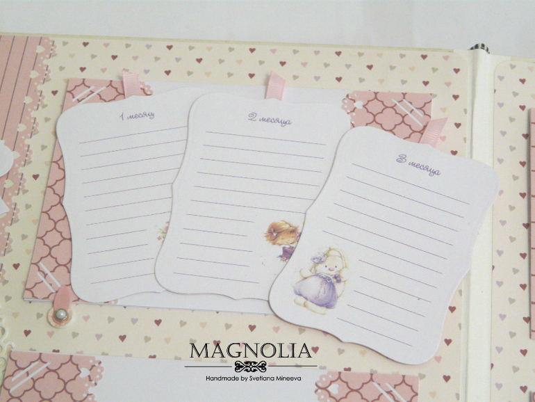 Так же есть конверты для фото УЗИ, бирочки, локона, карточки для записи веса, роста, зубок, достижений, обводки ножки и ладошки. Много карточек для записи заметок к фото по месяцам, тематическим фото, с нового года и дня рождения. Есть поля с данным при рождении, с выписки, с крещения, карточка с описанием имени