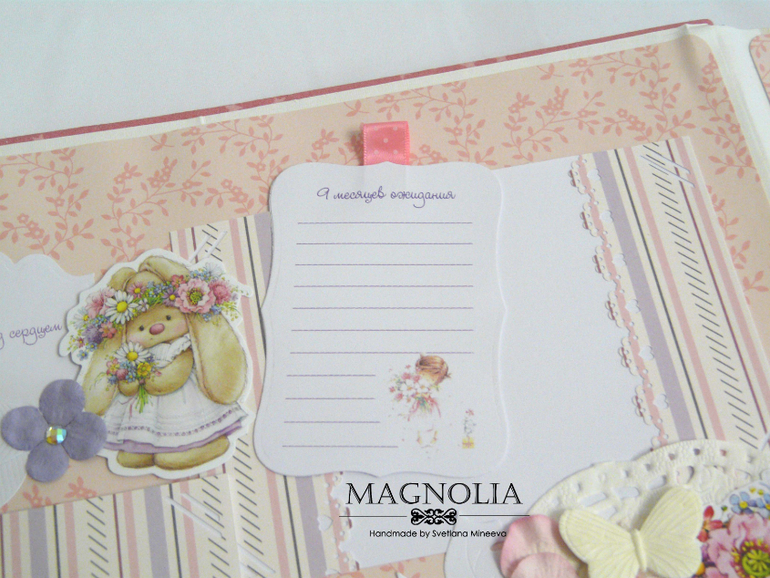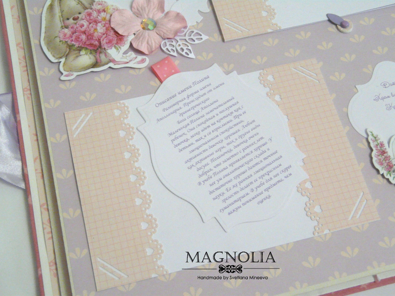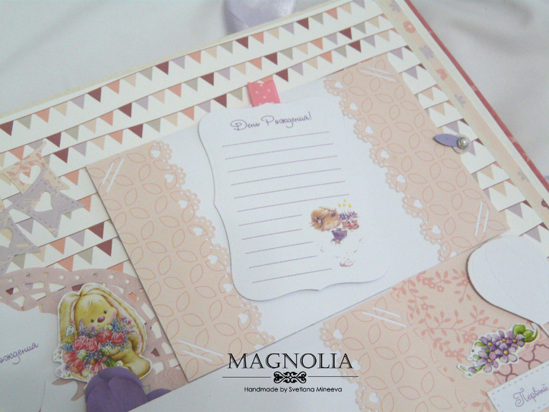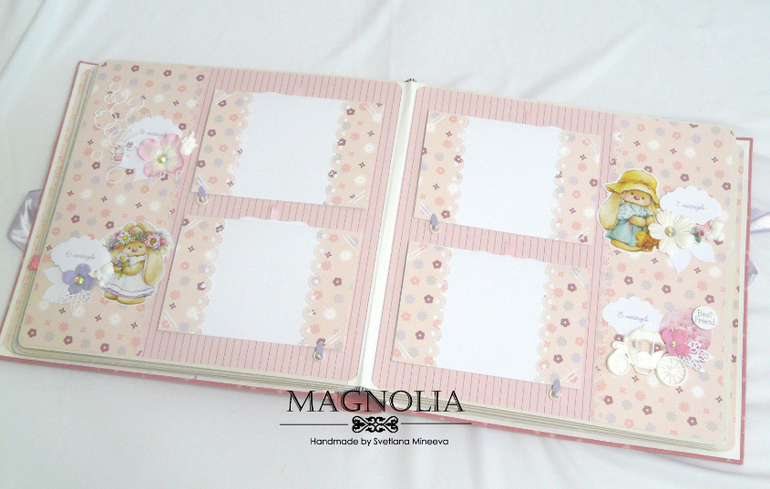 Альбомчик о первом годе жизни с зайкой Ми для малышки Полины. Формат альбома 30*30 см, переплет по МК Е.Виноградовой. 9 разворотов (18 страниц).