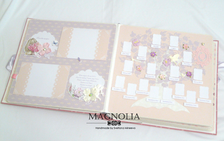 В альбоме предусмотрены места для фото беременности, при рождении и выписки из РД, фото мамы и папы, с крещения, по месяцам, с первого нового года и дня рождения, тематических фото. Для фото всей семьи создано семейное дерево.