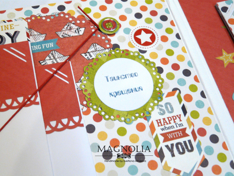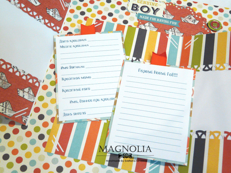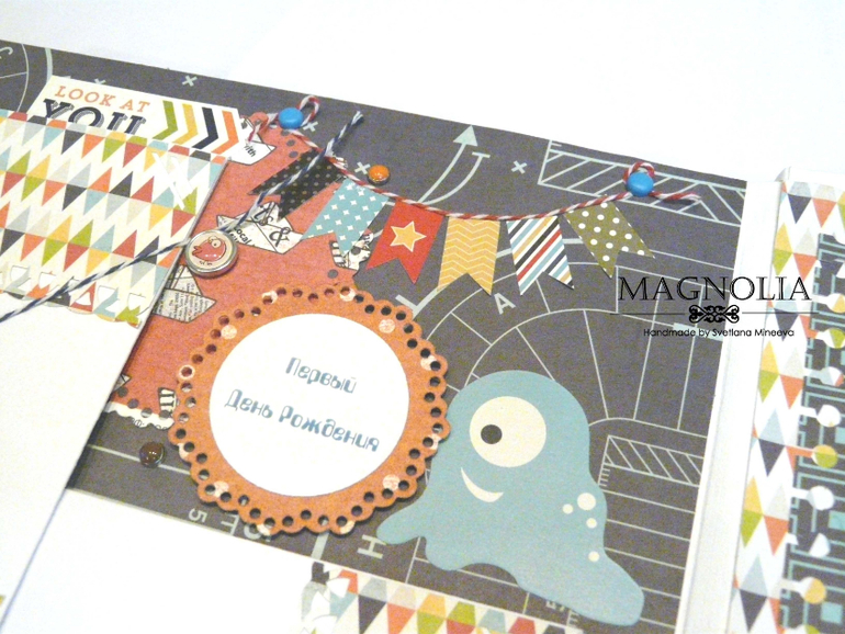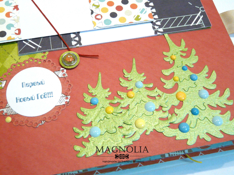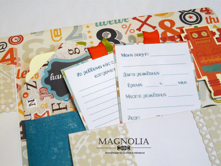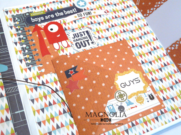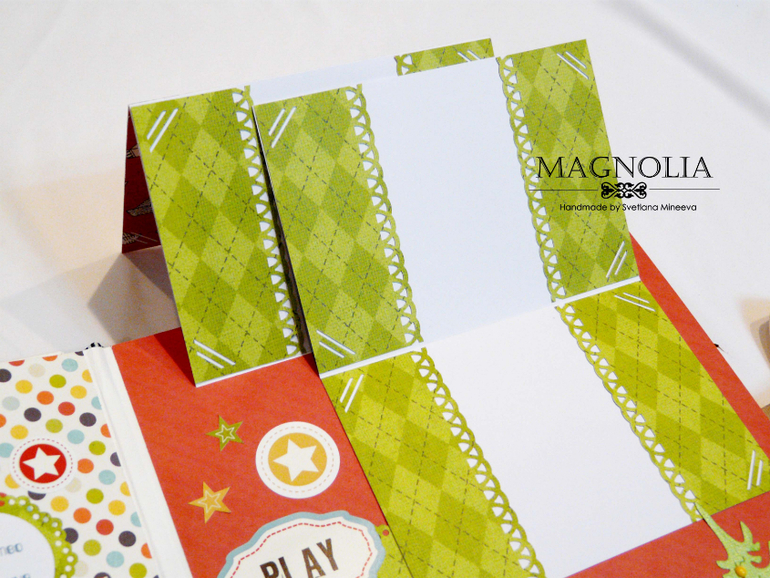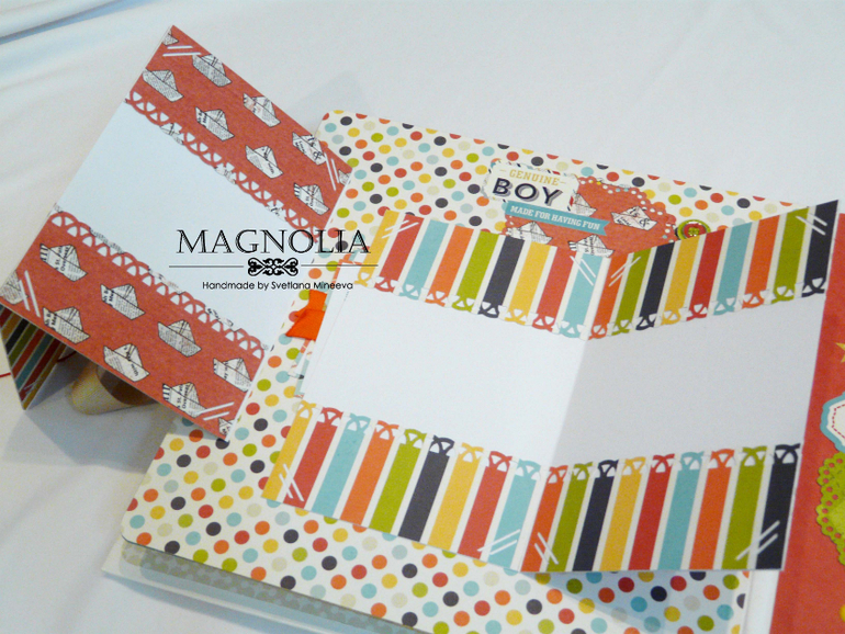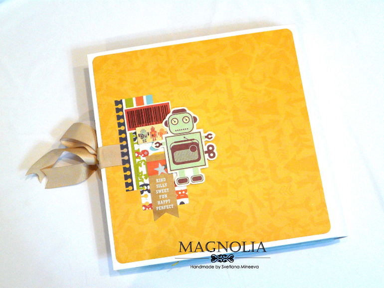 А я сегодня с ярким мальчуковым альбомом для мальчика. Формат 25*25 см, обложка бумажная, 5 разворотов (10 страниц). Разделён на темы: в ожидании, я родился, крещение, первый Новый год, моя семья, мои путешествия, первый День Рождения