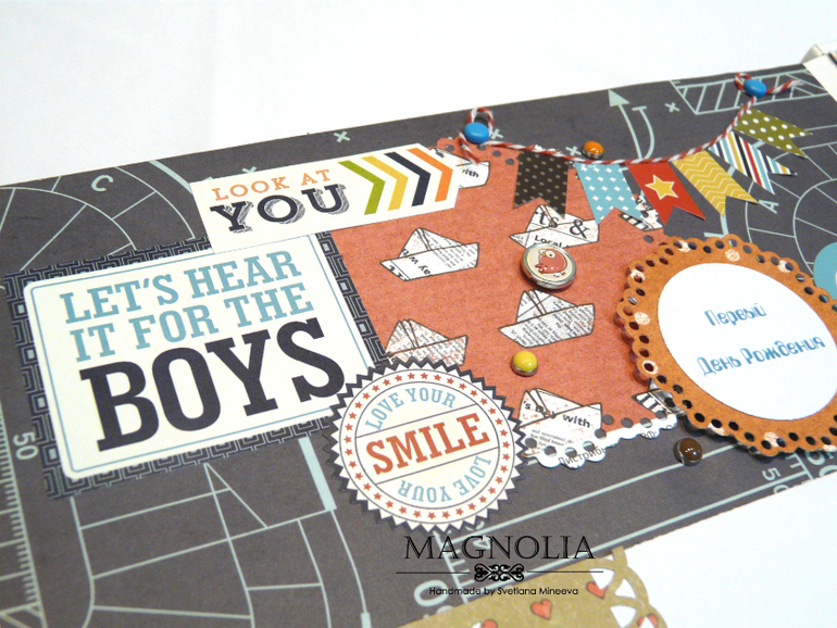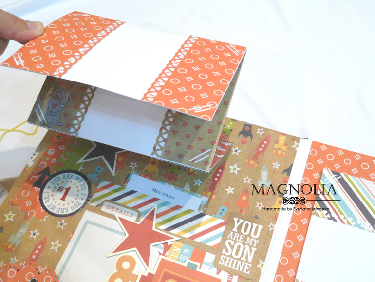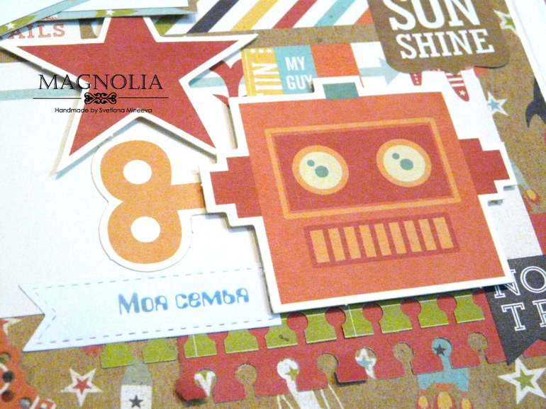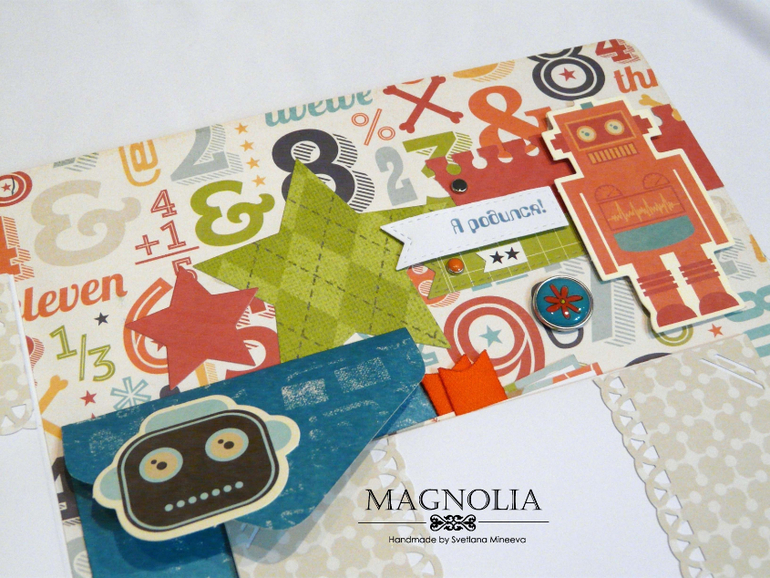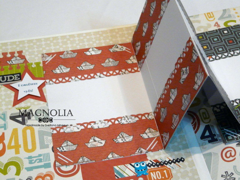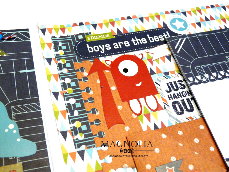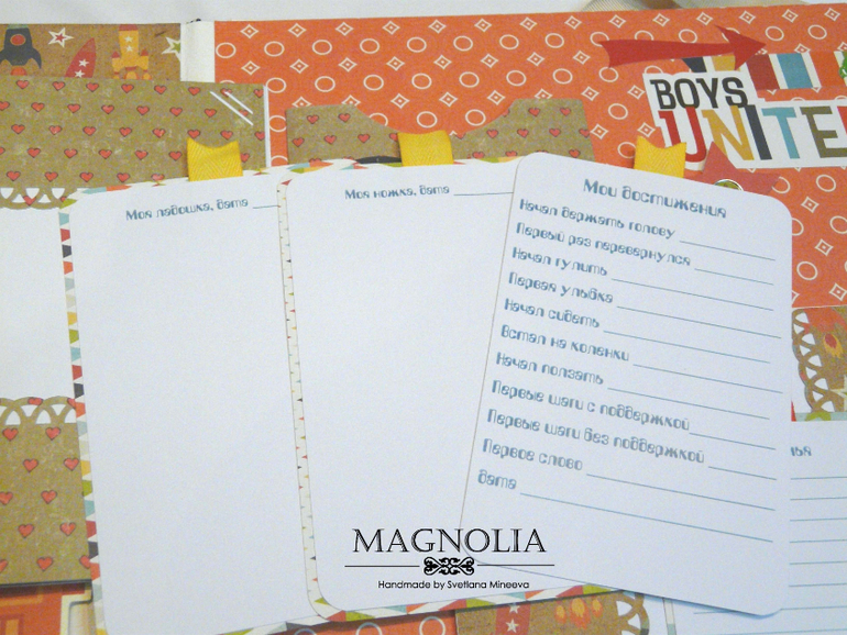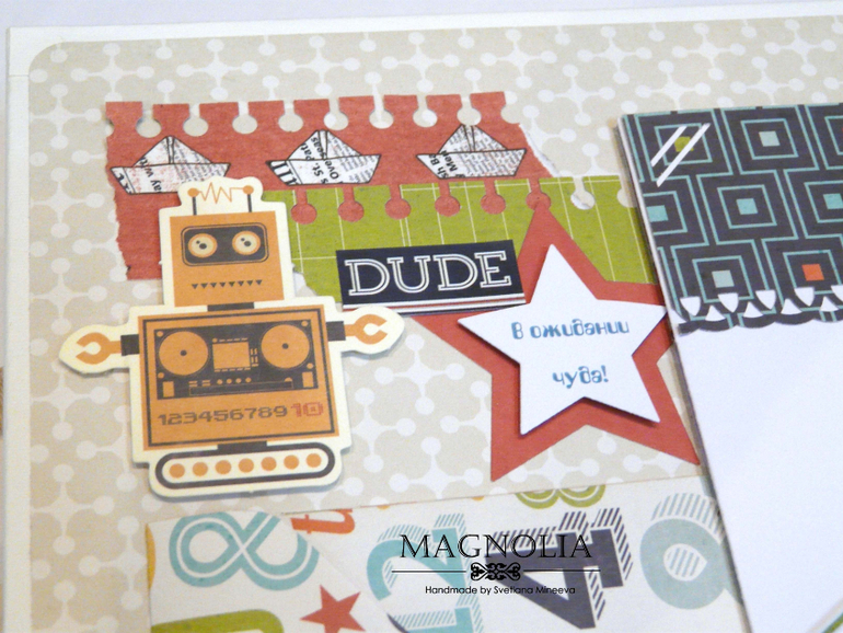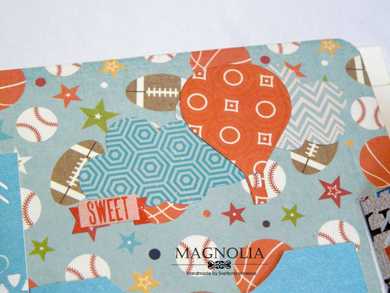 А я сегодня с ярким мальчуковым альбомом для мальчика. Формат 25*25 см, обложка бумажная, 5 разворотов (10 страниц). Разделён на темы: в ожидании, я родился, крещение, первый Новый год, моя семья, мои путешествия, первый День Рождения