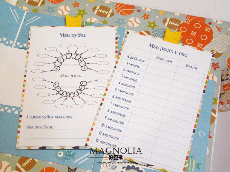 Альбом вмещает в себя 70 фото 10*15 см, много кармашков, карточки для записи веса, роста, зубок, достижений, обводки ножки и ладошки. Много тегов для записи доп. информации