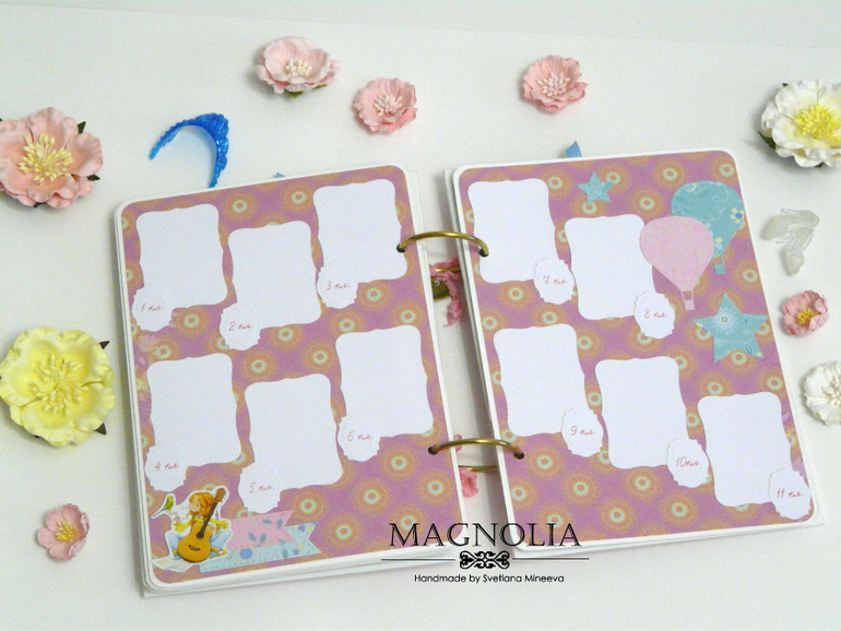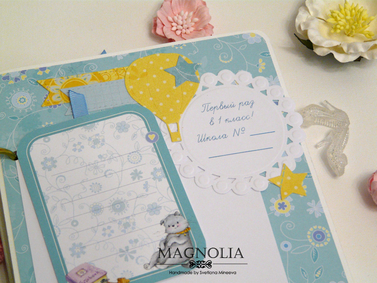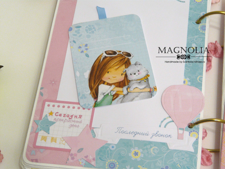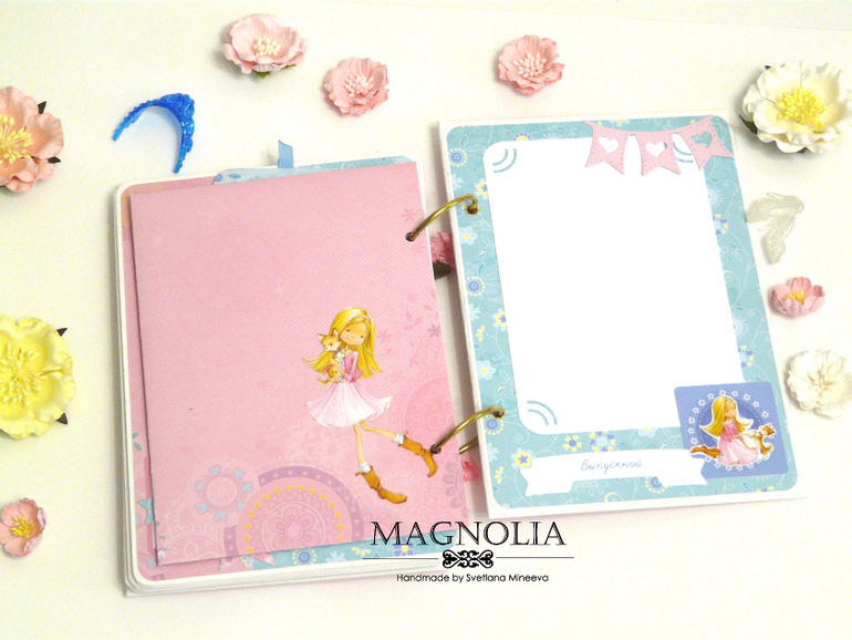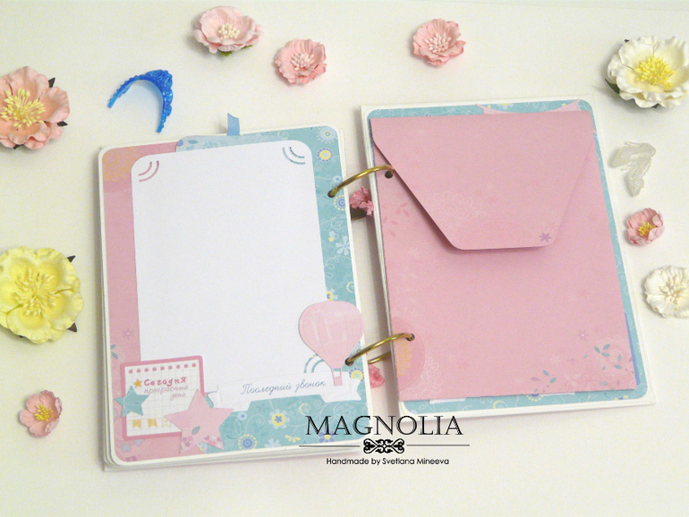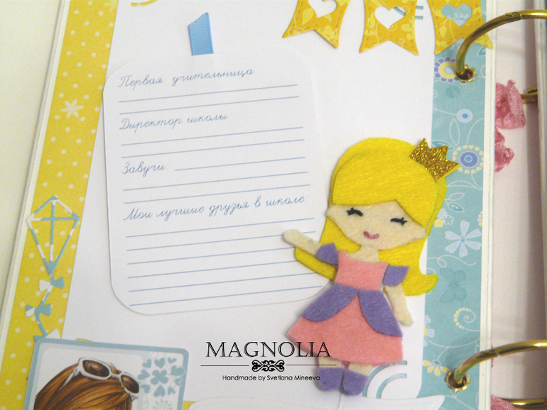 Есть места для фото с 1 сентября 1 класса и с последнего звонка и выпускного старшеклассницы, разворот для маленьких фото с 1 по 11 класс (на каждый год). Так же предусмотрены два конверта для доп. фото