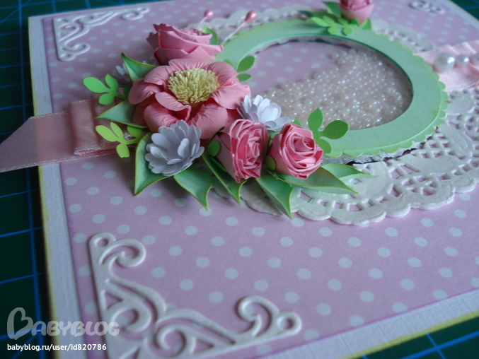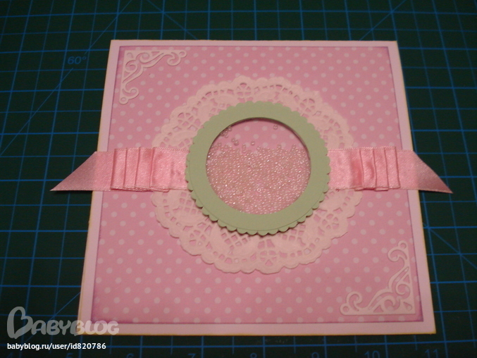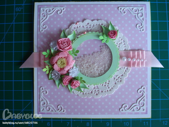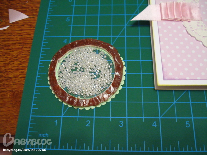 На полученное окошко наклеиваю подложку, вырезанную из бумаги, которую кладут в коробки с конфетами (да-да, даже такое барахло можно использовать в работе :), чтобы таким образом приподнять окошко над основой открытки и полученное пространство заполнить бисером