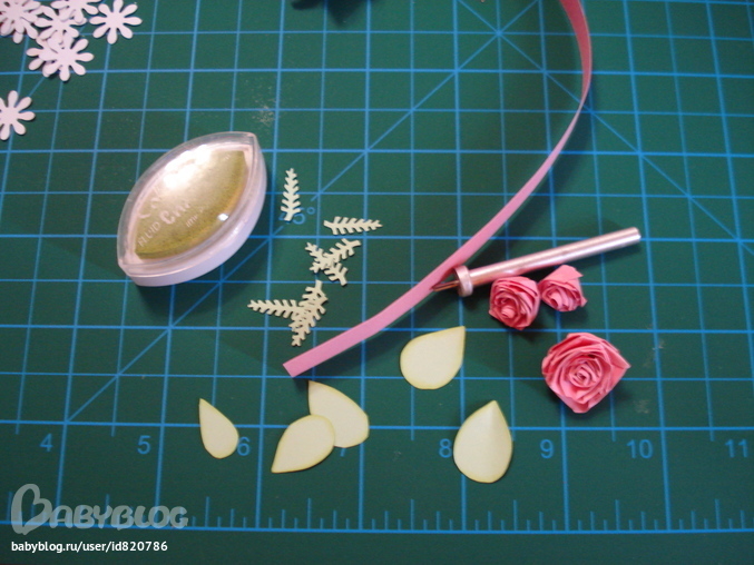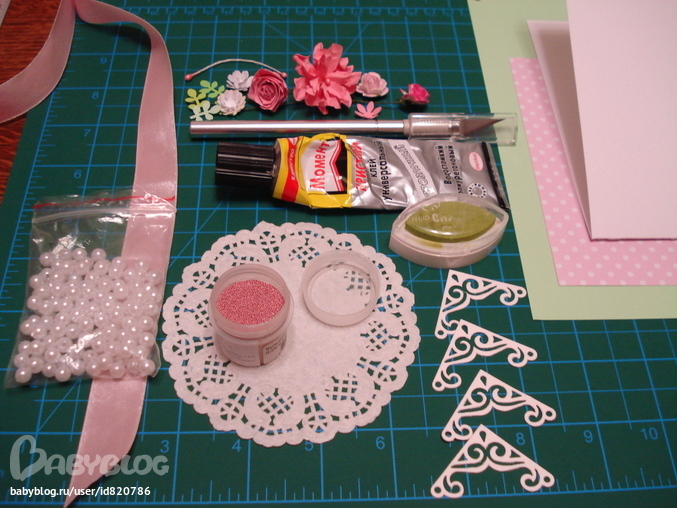 6.Для декора: бисер и бусины разного размера, атласная лента, ажурная салфетка, высечки «Уголок», бумага для квиллинга