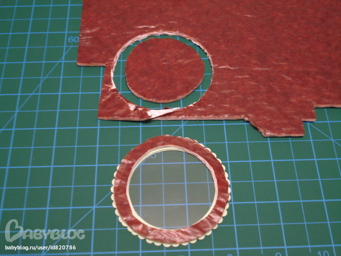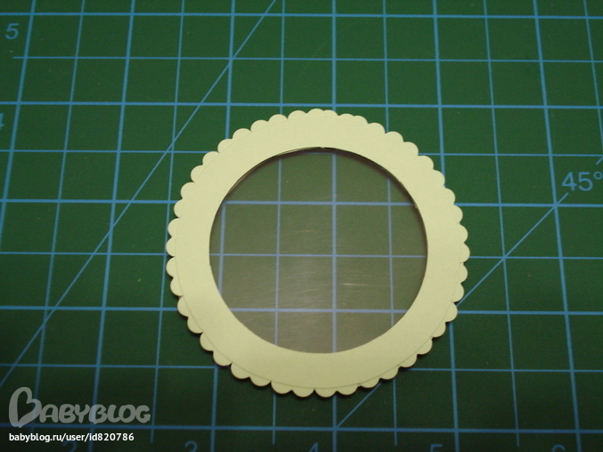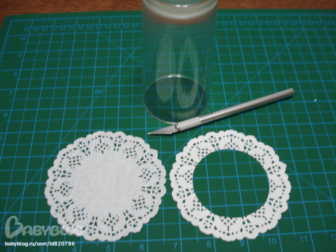 Из ажурной салфетки при помощи макетного ножа и обычного стаканадиаметром6,5 смвырезаем вот такую заготовку: