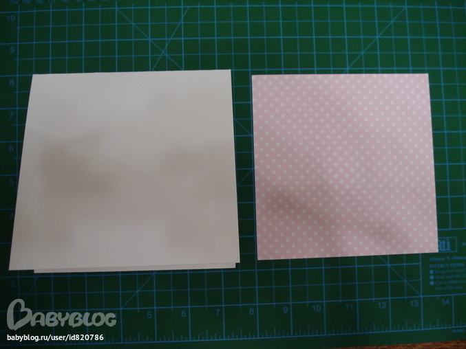 Из белой бумаги вырезаем квадрат размером 15х15 см, из розовой 14х14 см.